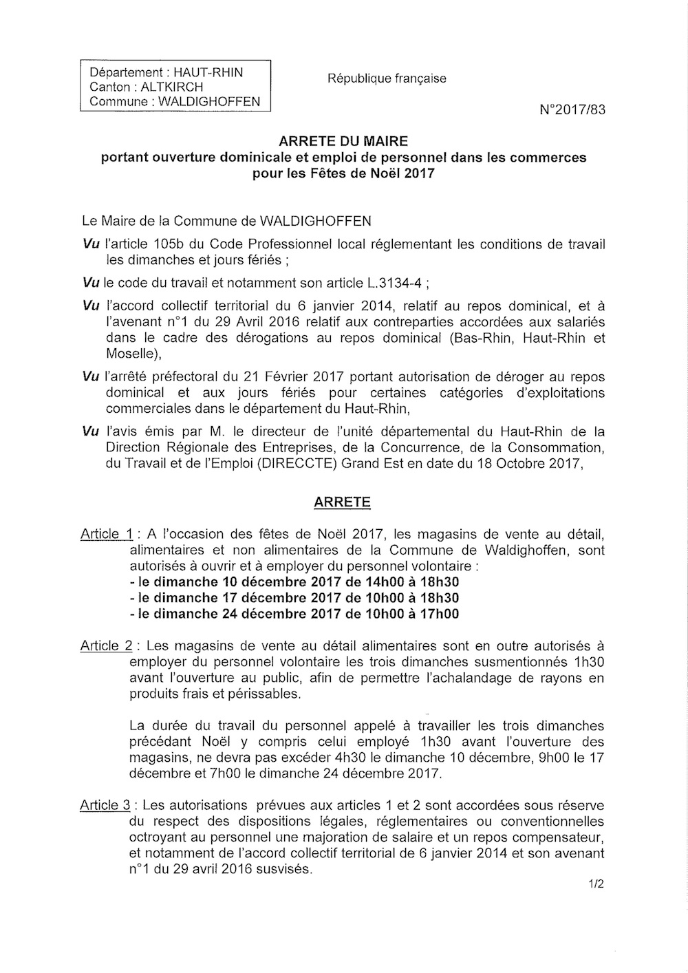 Arrêté portant ouverture dominicale et emploi de personnel dans les commerces pour les Fêtes de Noël 2017