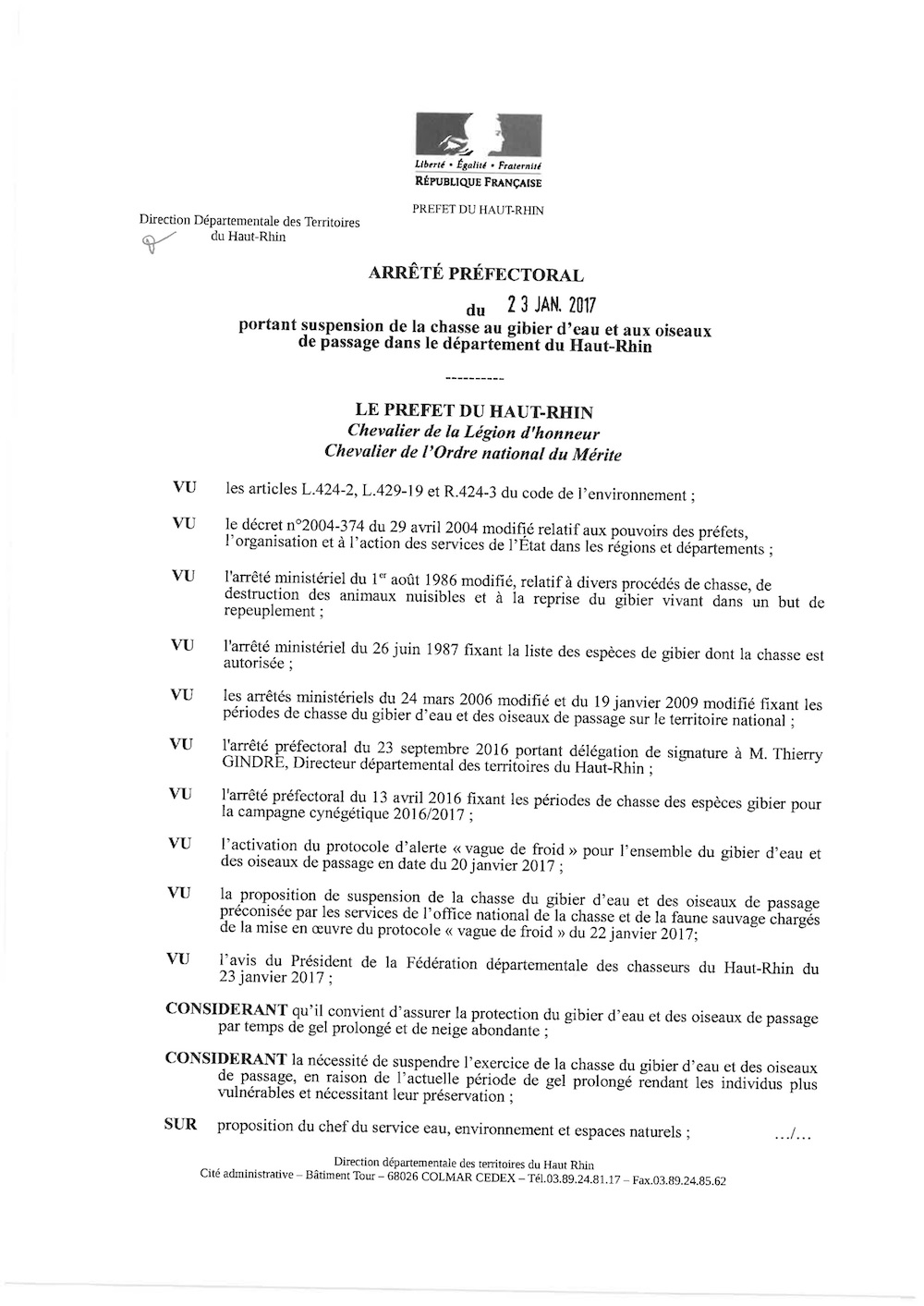 Arrêté préfectoral portant suspension de la chasse au gibier d'eau et aux oiseaux de passage dans le département du Haut-Rhin
