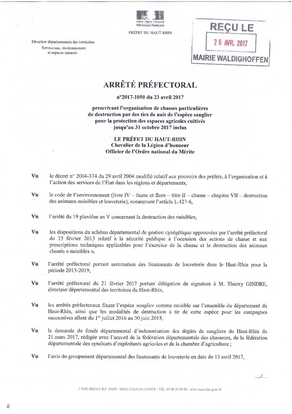 Arrêté prescrivant l'organisation de chasses particulières de destruction par des tirs de nuits de l'espèce sanglier pour la protection des espaces agricoles cultivés jusqu'au 31 octobre 2017 inclus. P1