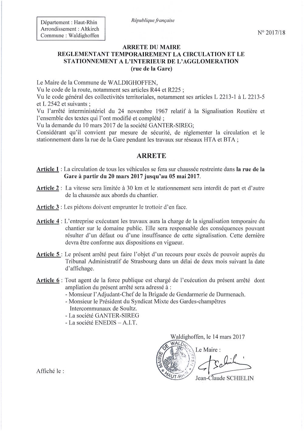 Arrêté règlementant temporairement la circulation et le stationnement rue de la Gare