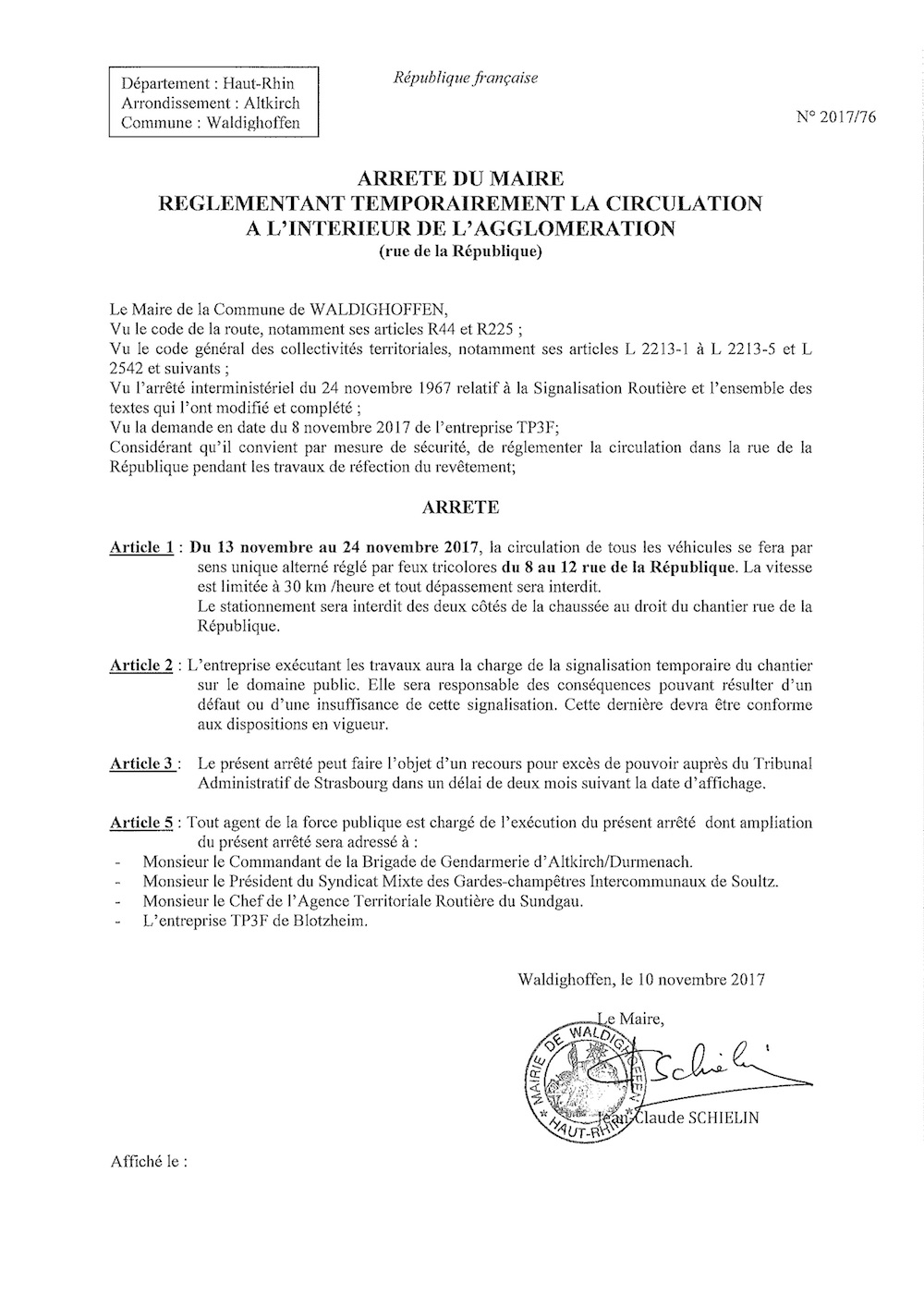 Arrêté réglementant temporairement la circulation et le stationnement rue de la République