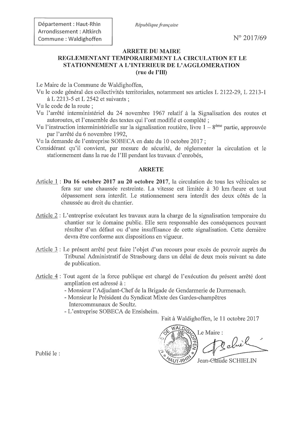 Arrêté réglementant temporairement la circulation et le stationnement rue de l'Ill