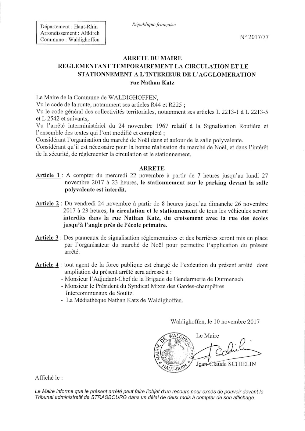Arrêté réglementant temporairement la circulation et le stationnement rue Nathan Katz