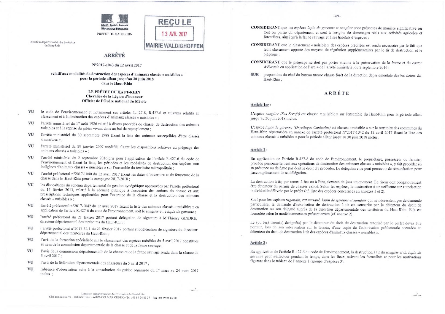 Arrêté relatif aux modalités de destruction des espèces d'animaux classés "nuisibles"
