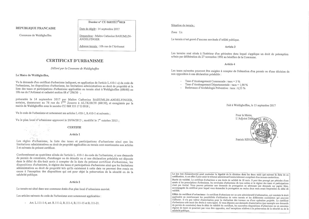 Certificat d'urbanisme délivré à Maître BAEUMLIN-ANDELFINGER