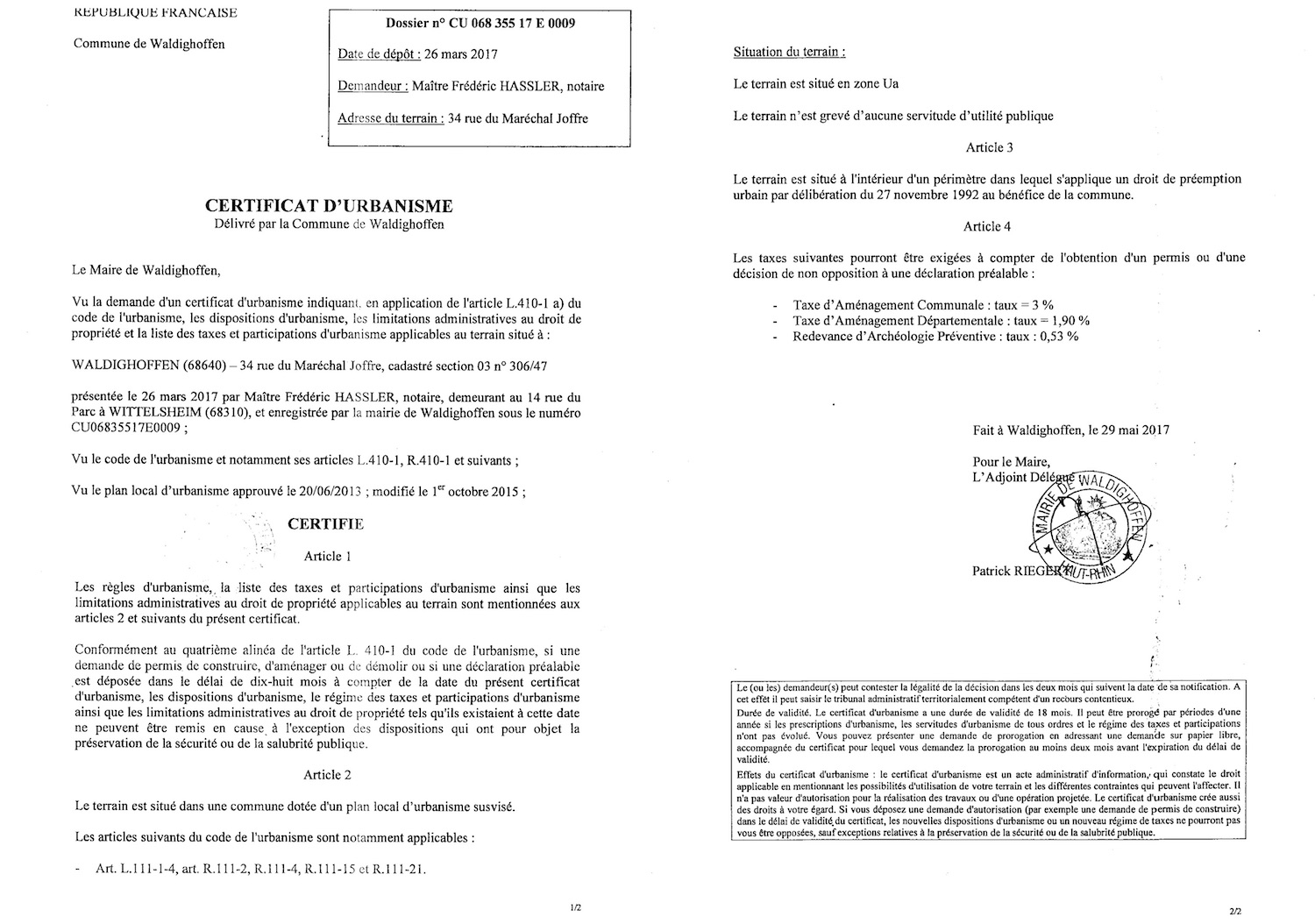 Certificat d'urbanisme délivré à Maître HASSLER