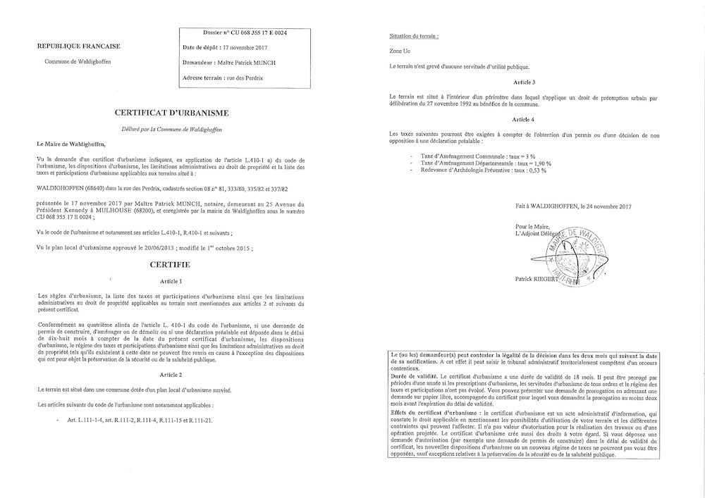 Certificat d'urbanisme délivré à Maître MUNCH