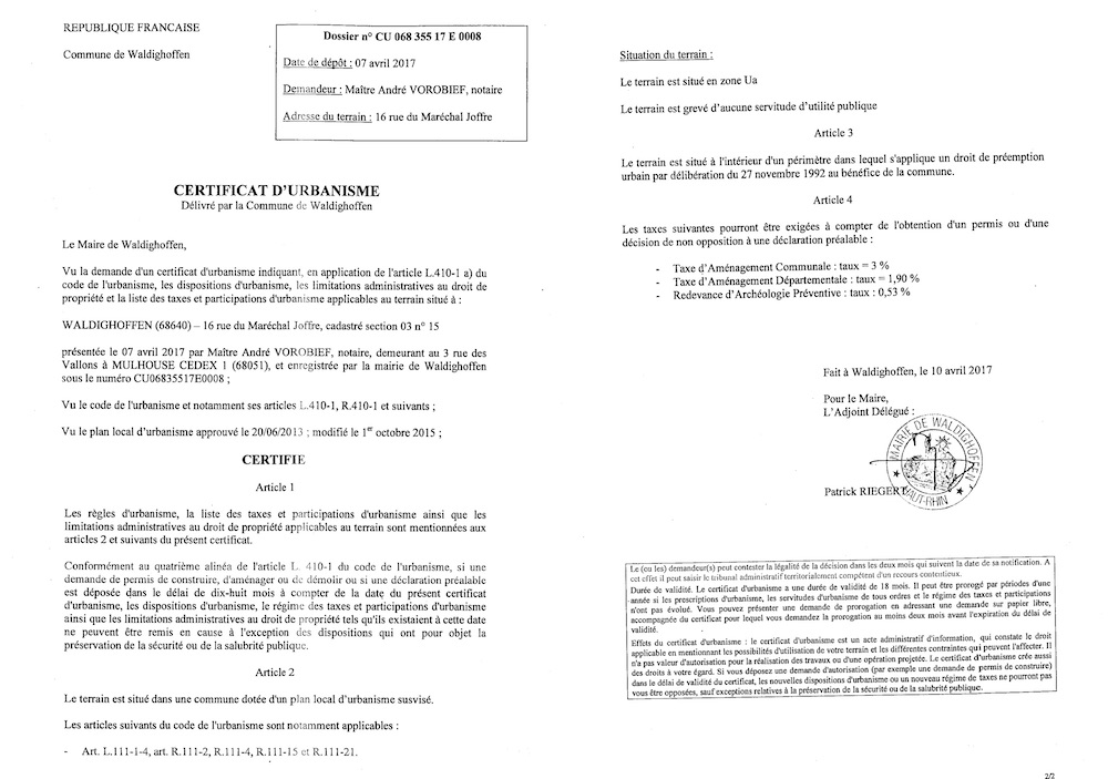 Certificat d'urbanisme délivré à Maître VOROBIEF