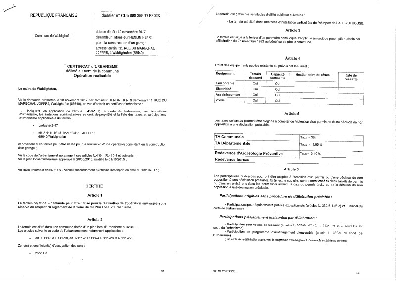 Un certificat d'urbanisme opérationnel a été établi pour Monsieur Henri HENLIN, concernant une parcelle située au 11 rue du Maréchal Joffre