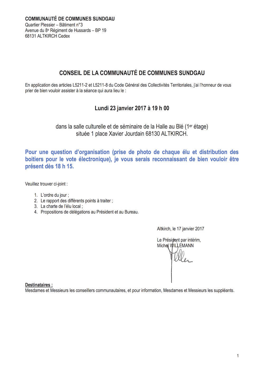 Convocation du conseil communautaire de la Communauté de Communes Sundgau
