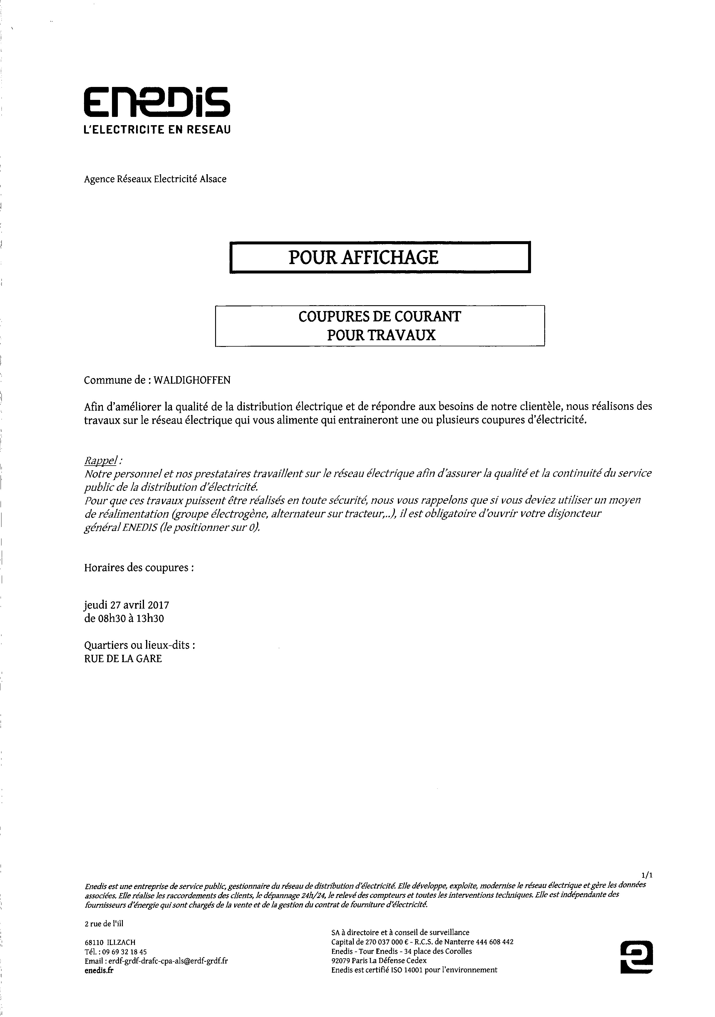Une coupure de courant est prévue le jeudi 27 avril 2017 entre 08h30 et 13h30, pour travaux rue de la gare.