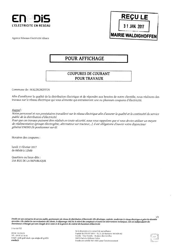Vous êtes ici : Accueil Mairie Affichage public Annexes affichage public 2017 Coupure de courant le lundi 13 février 2017