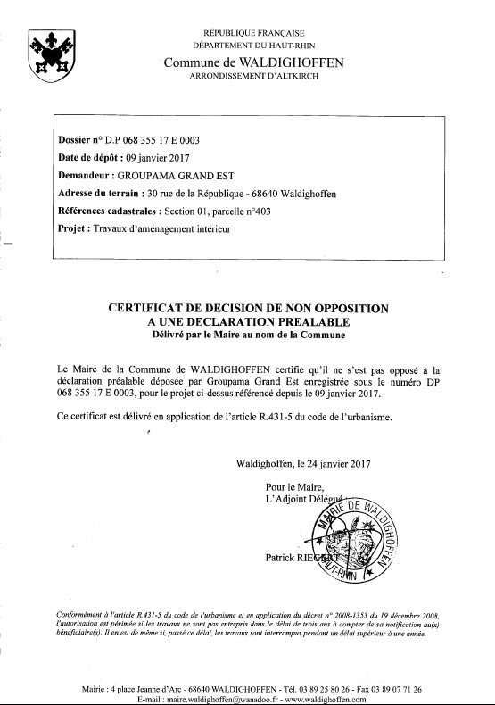 Avis de non opposition à la déclaration préalable déposée par Groupama Grand Est