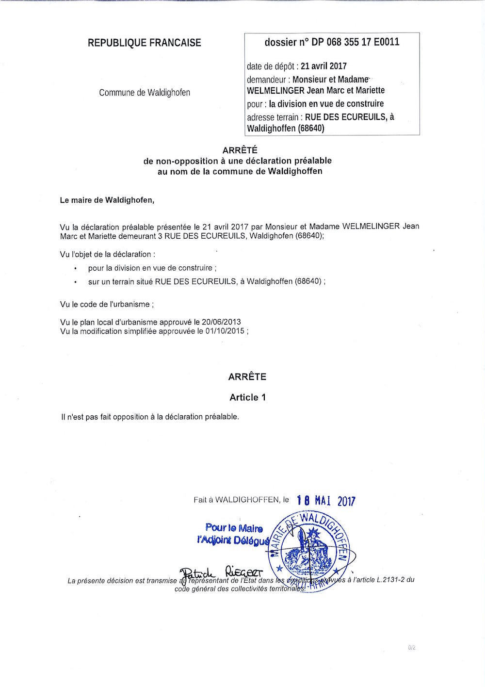 Décision à la déclaration préalable de M. et Mme WELMELINGER Jean Marc et Mariette