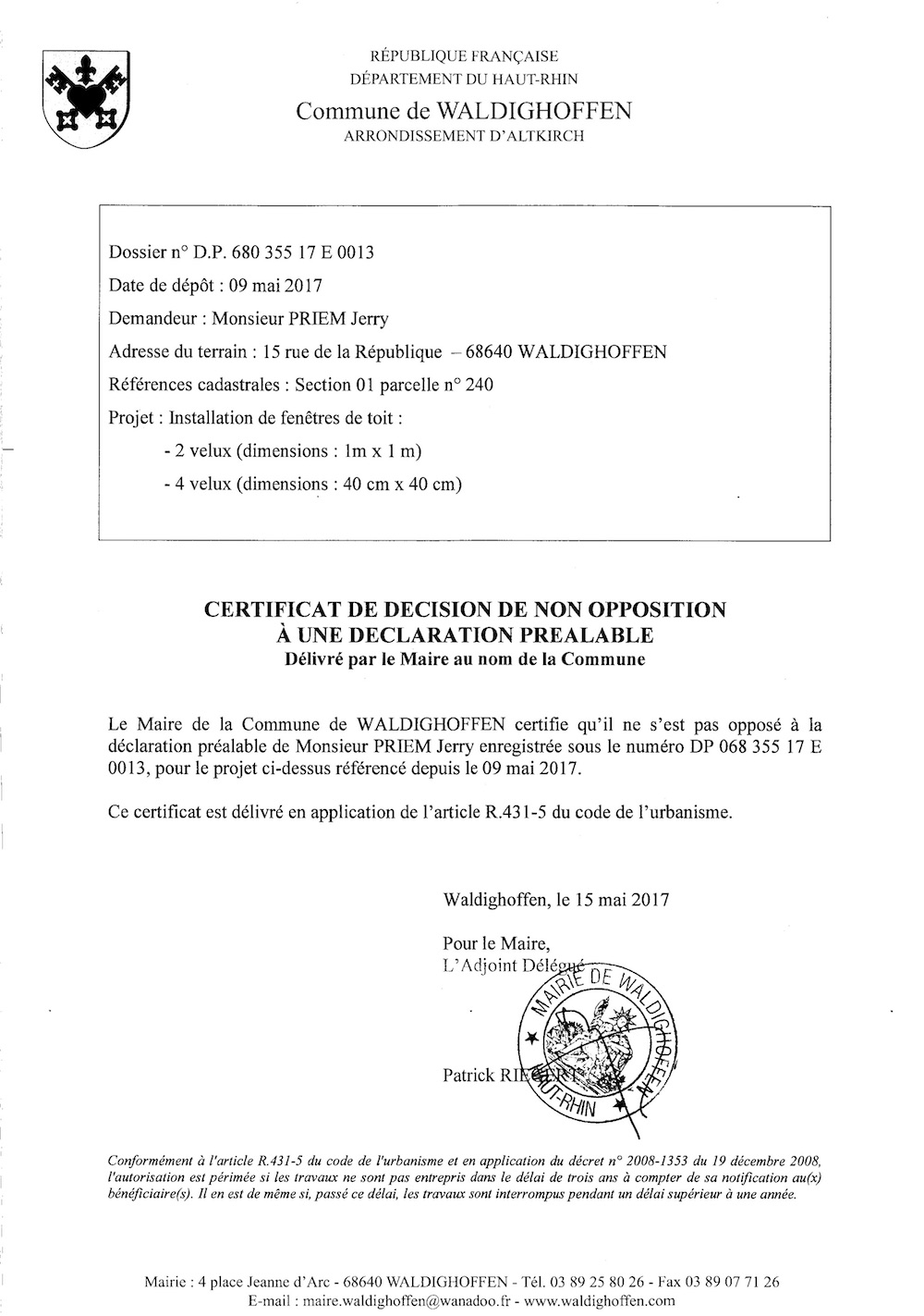 Vous êtes ici : Accueil Mairie Affichage public Annexes affichage public 2017 Décision à la déclaration préalable de M. PRIEM Jerry