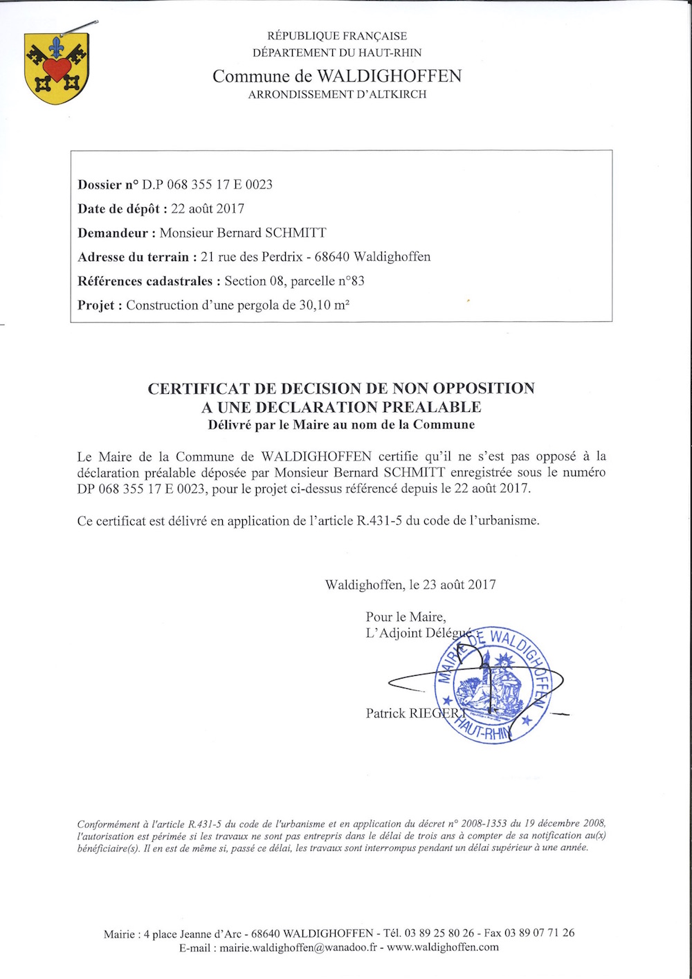 Vous êtes ici : Accueil Mairie Affichage public Annexes affichage public 2017 Décision à la déclaration préalable de M. SCHMITT