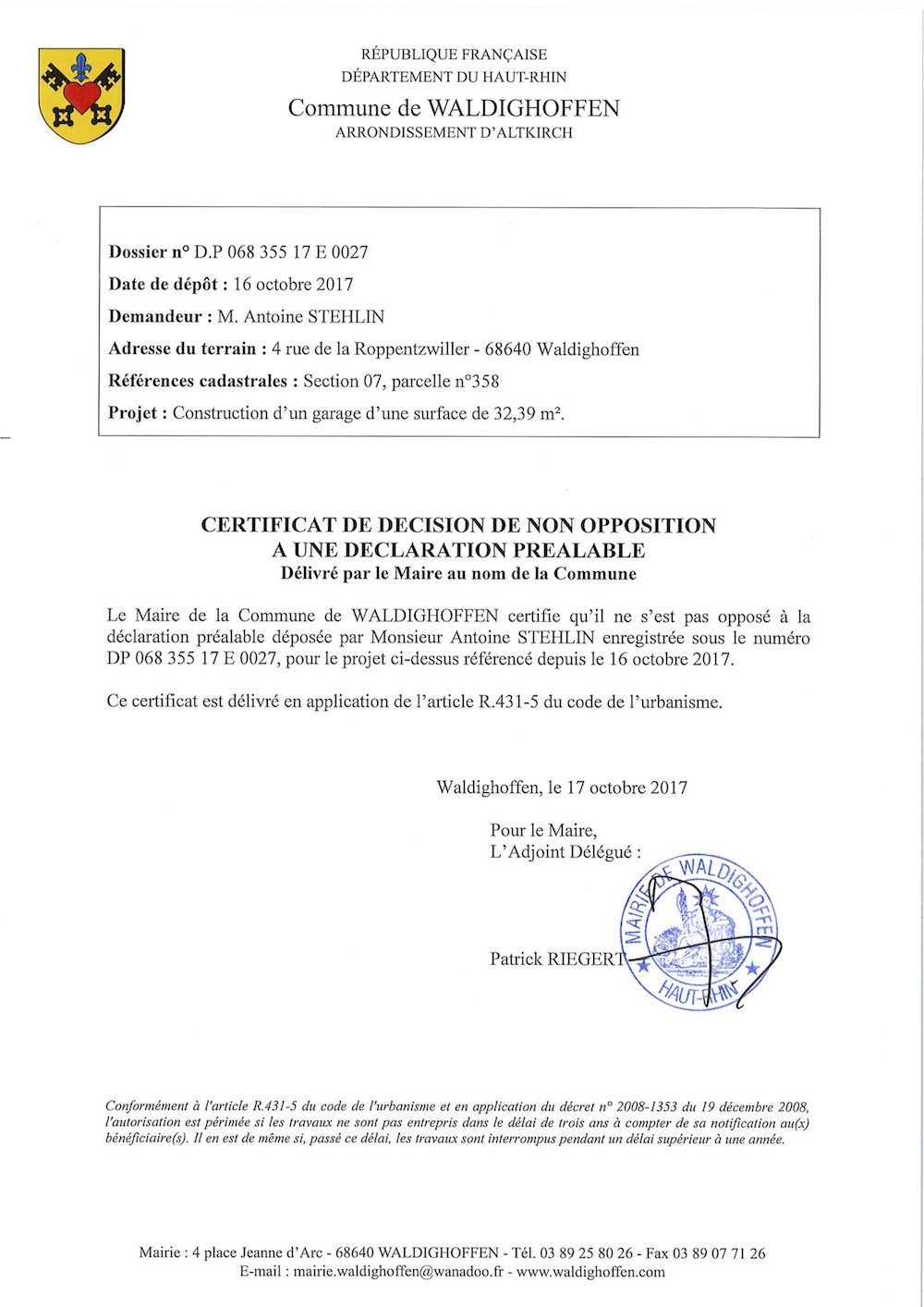 Vous êtes ici : Accueil Mairie Affichage public Annexes affichage public 2017 Décision à la déclaration préalable de M.STEHLIN