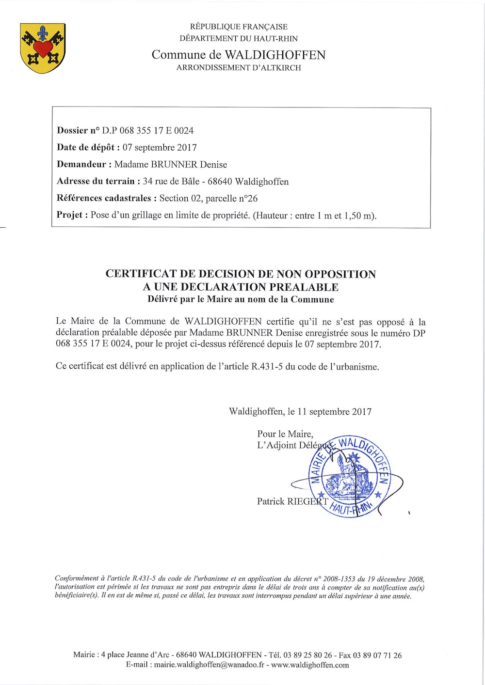 Vous êtes ici : Accueil Mairie Affichage public Annexes affichage public 2017 Décision à la déclaration préalable de Mme BRUNNER