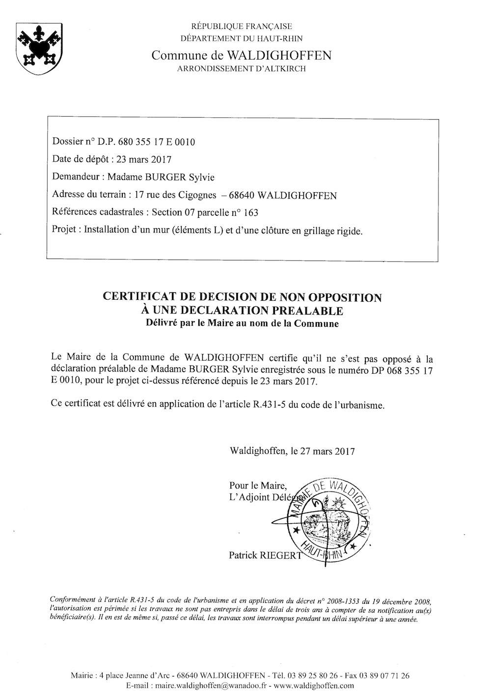 Vous êtes ici : Accueil Mairie Affichage public Annexes affichage public 2017 Décision à la déclaration préalable de Mme BURGER Sylvie