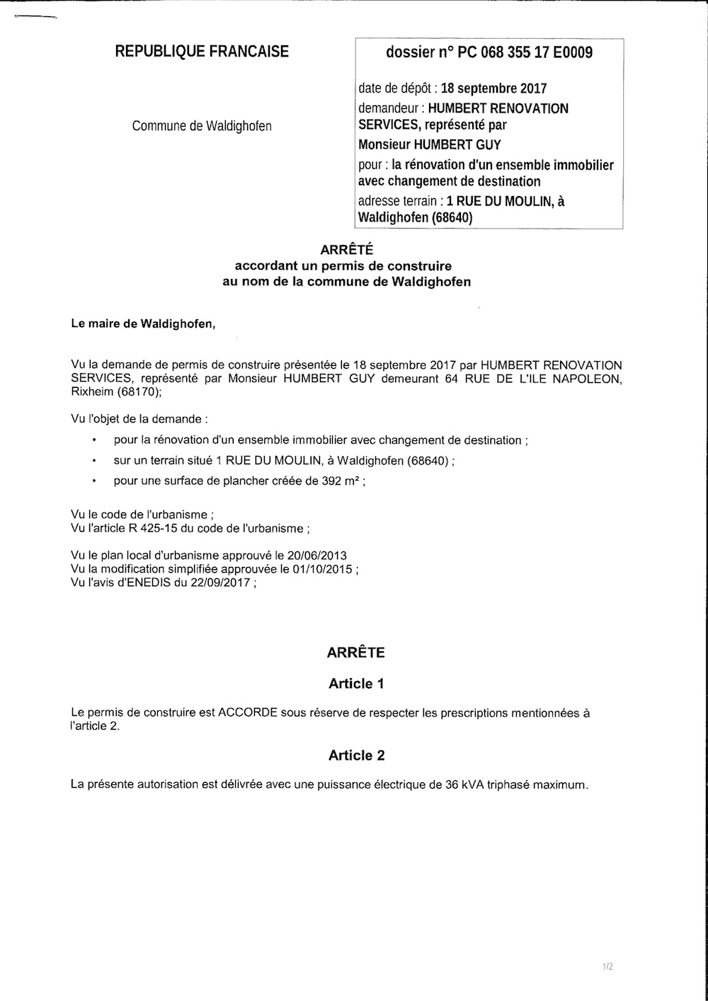 Décision à la demande de construire de HUMBERT RENOVATION SERVICES