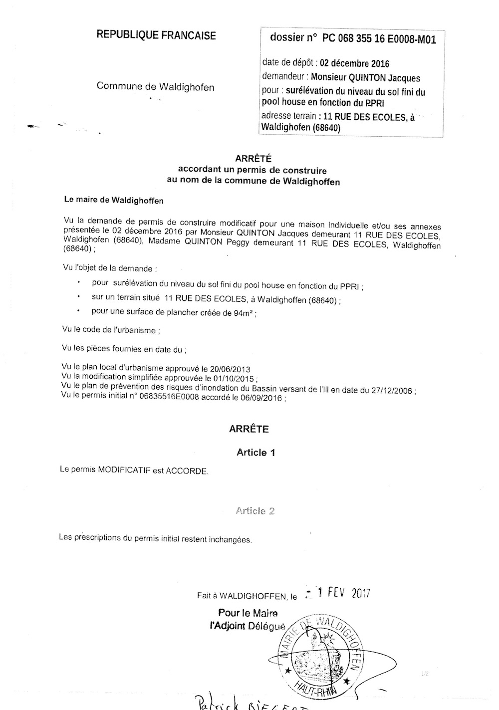 Arrêté accordant la demande de permis de construire modificatif à M. QUINTON Jacques pour la modification d'une maison individuelle et/ou ses annexes.