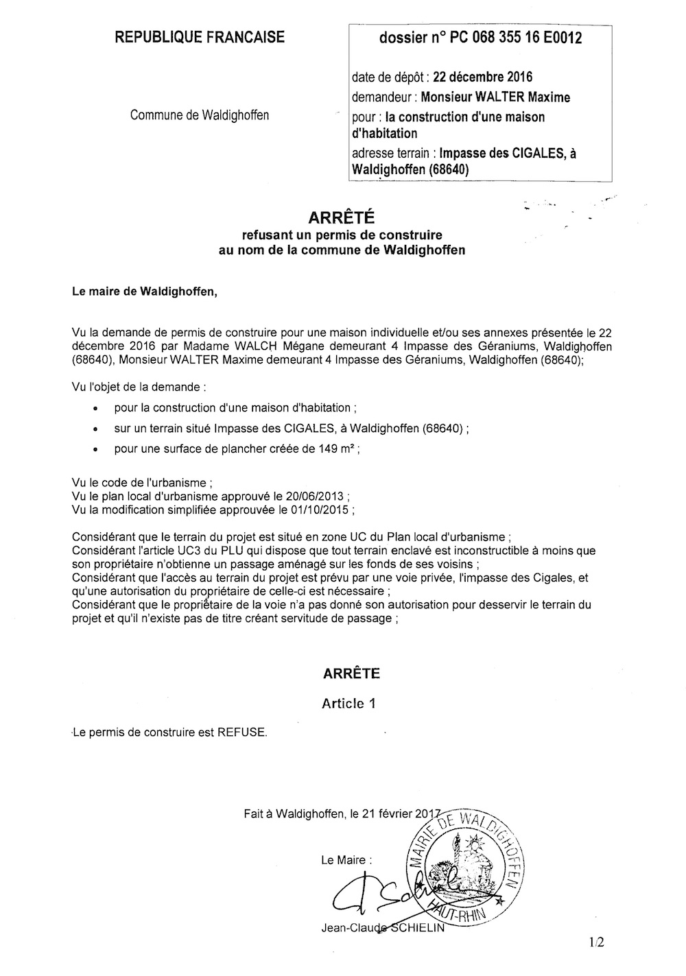 Arrêté refusant la demande de permis de construire à M. WALTER pour la construction d'une maison individuelle.
