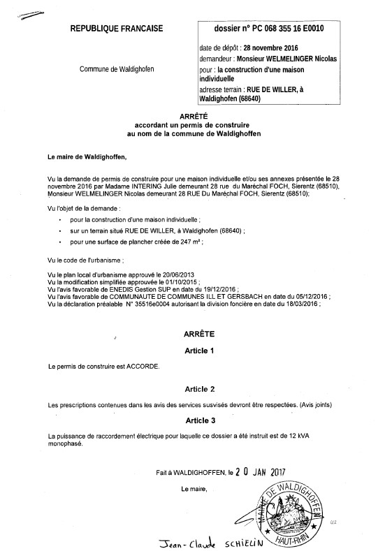 Décision à la demande de construire de M. WELMELINGER et Mme INTERING