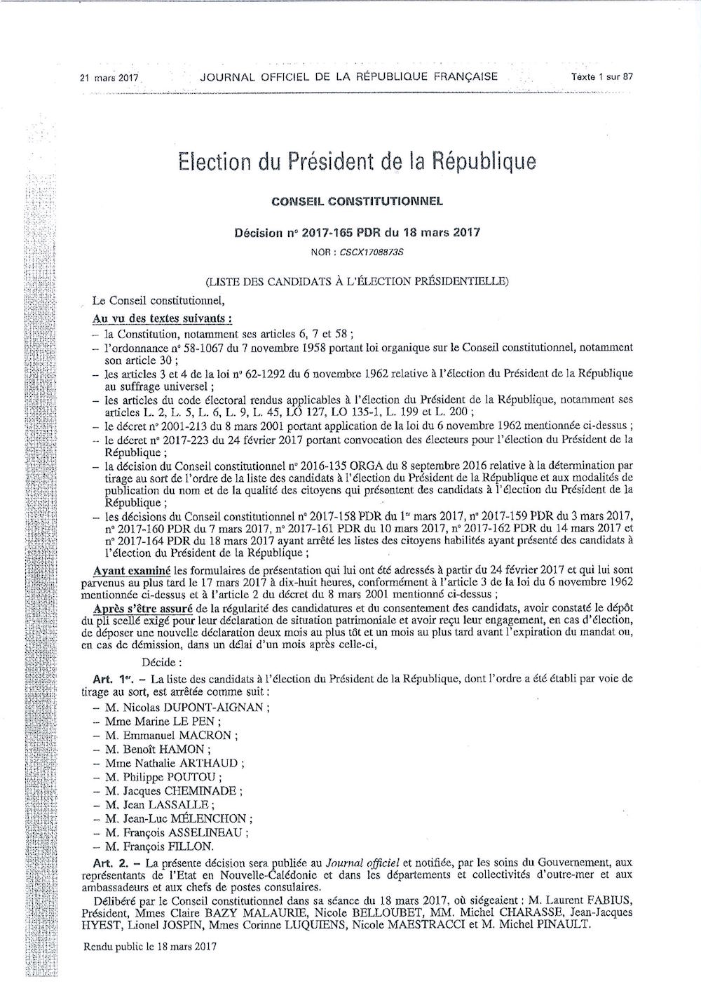 Élection du Président de la République - Conseil Constitutionnel - décision n°2017-165 PDR du 18 mars 2017