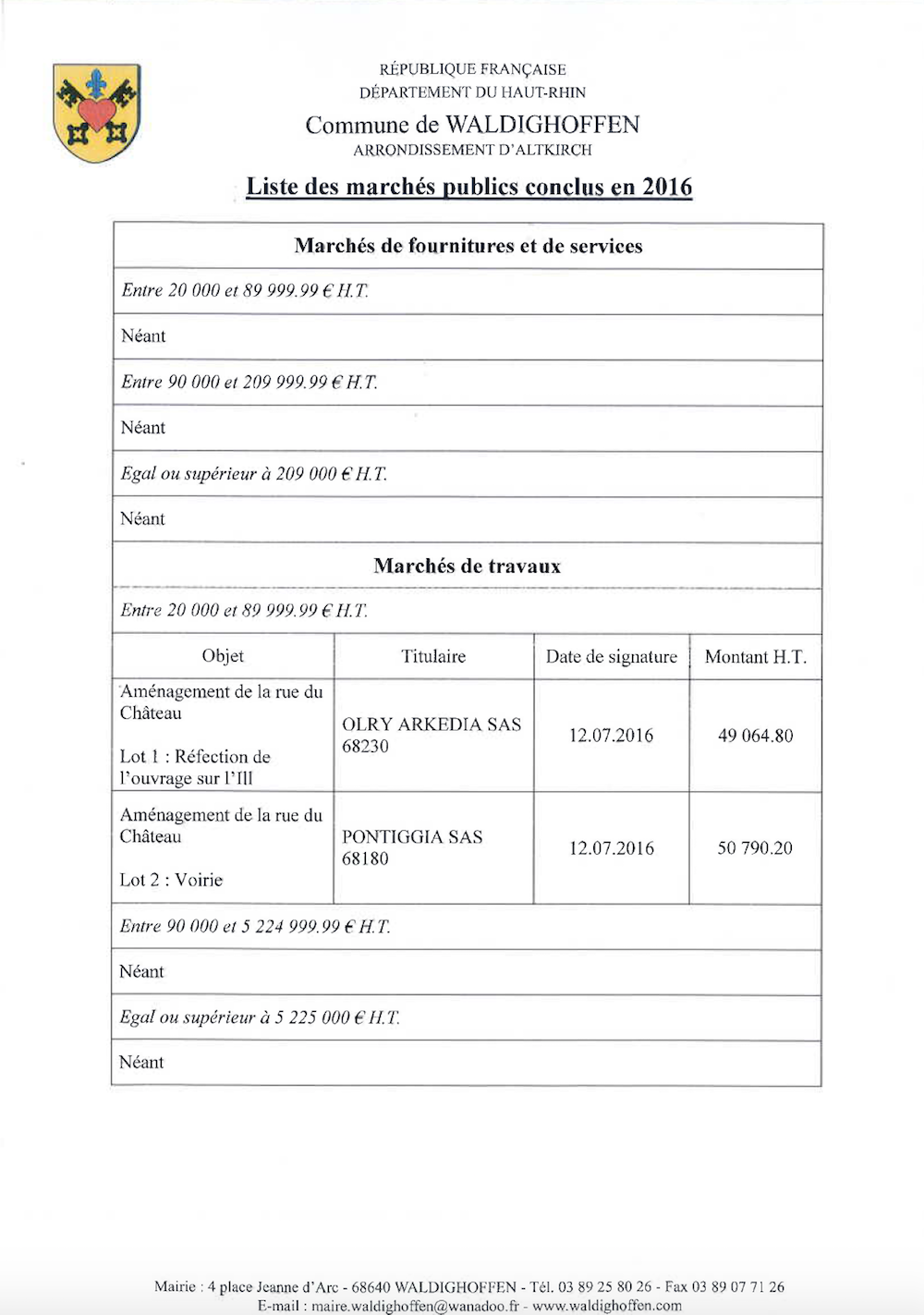 Vous êtes ici : Accueil Mairie Affichage public Annexes affichage public 2017 Liste des marchés publics conclus en 2016