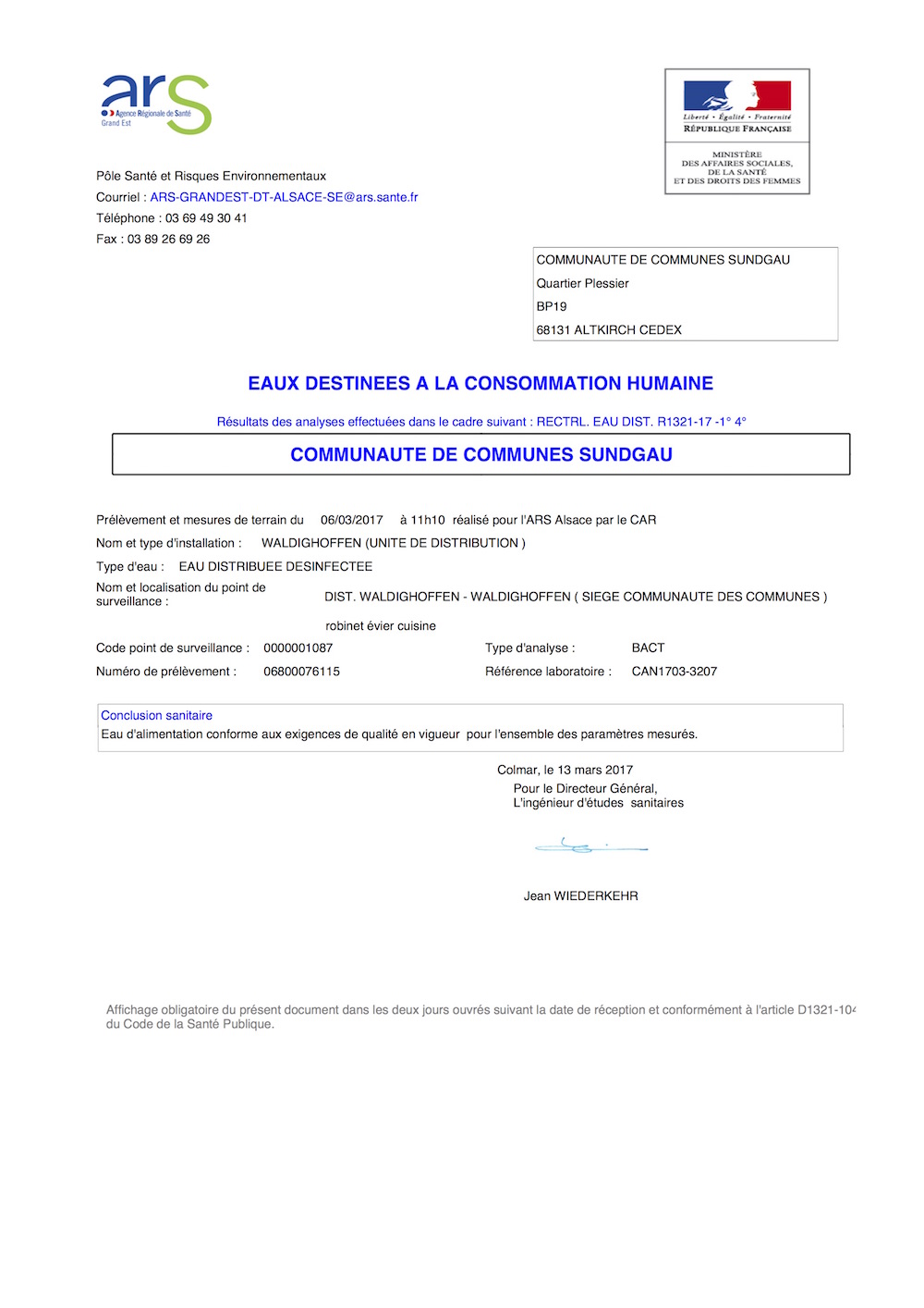 Copie du rapport d'analyse de l'eau potable de Waldighoffen. Prélèvement n° 06800076115 effectué le 06 mars 2017. 1/2