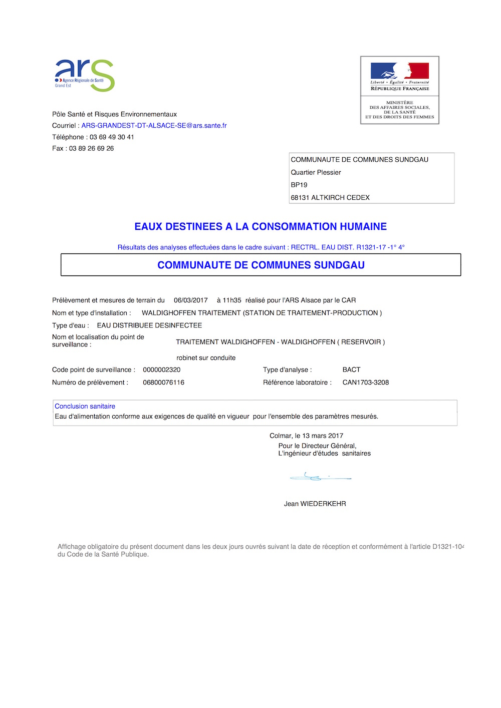 Copie du rapport d'analyse de l'eau potable de Waldighoffen. Prélèvement n° 06800076116 effectué le 06 mars 2017. 1/2