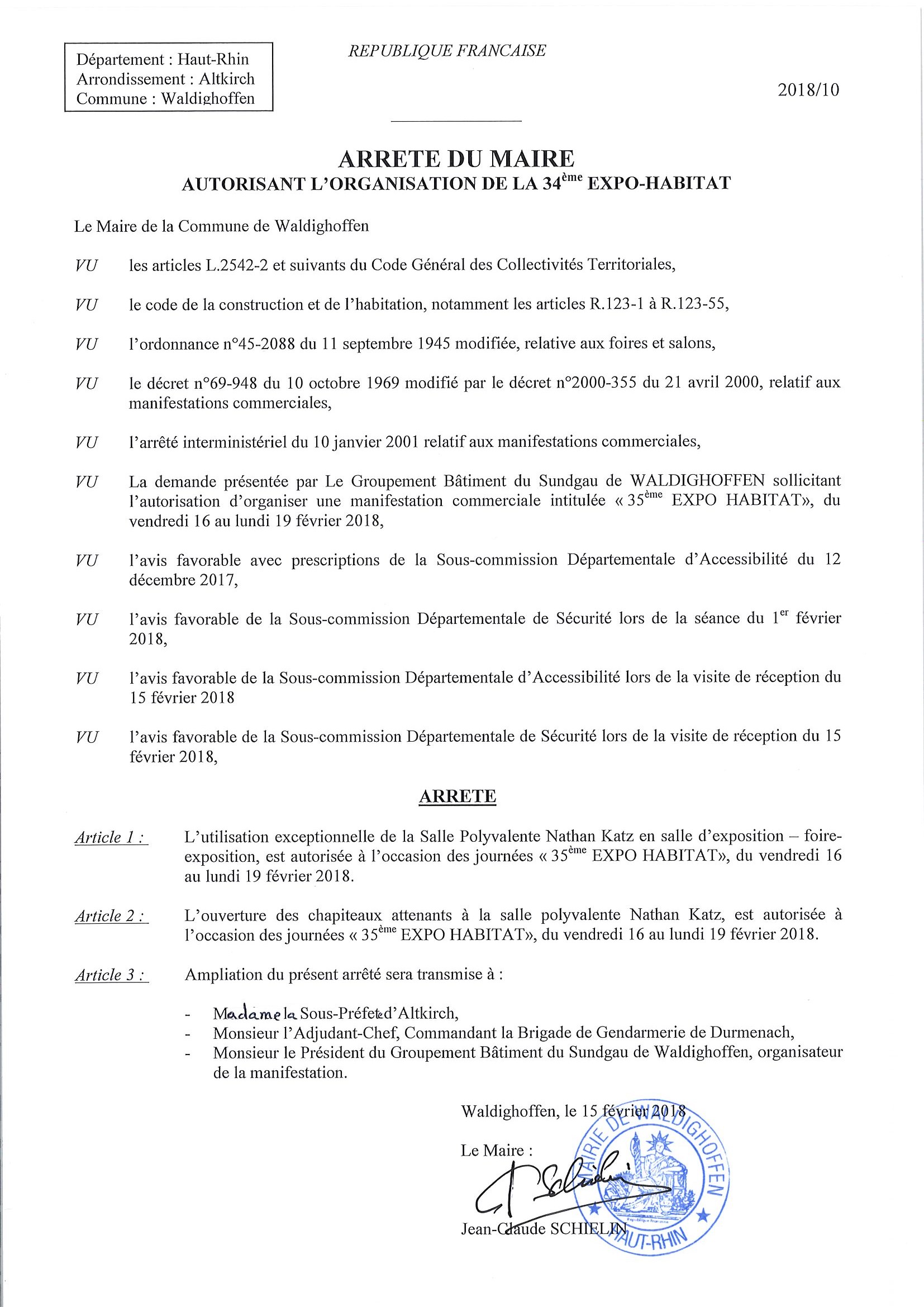 Vous êtes ici : Accueil Mairie Affichage public Annexes affichage public 2018 Arrêté autorisant l'organisation de la 35ème Expo-habitat