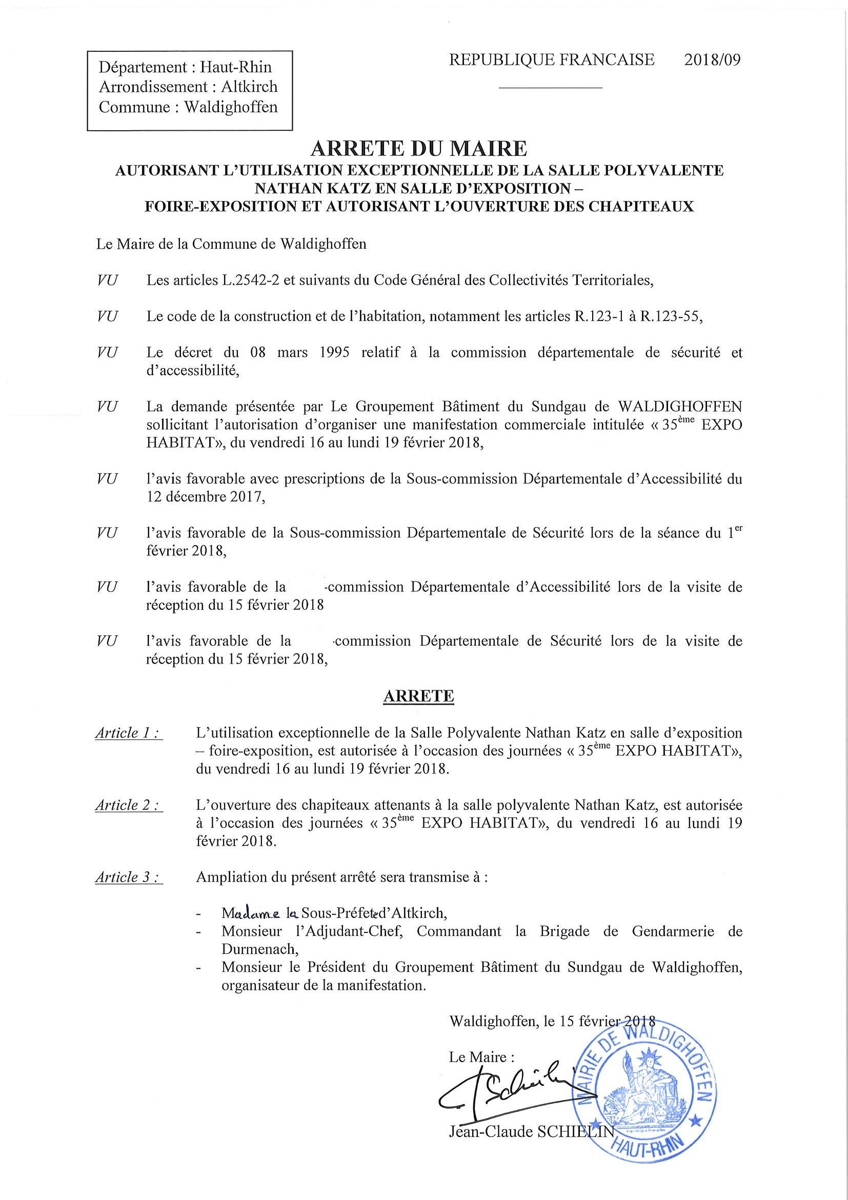 Arrêté autorisant l'utilisation de la Salle Polyvalente en foire-expo