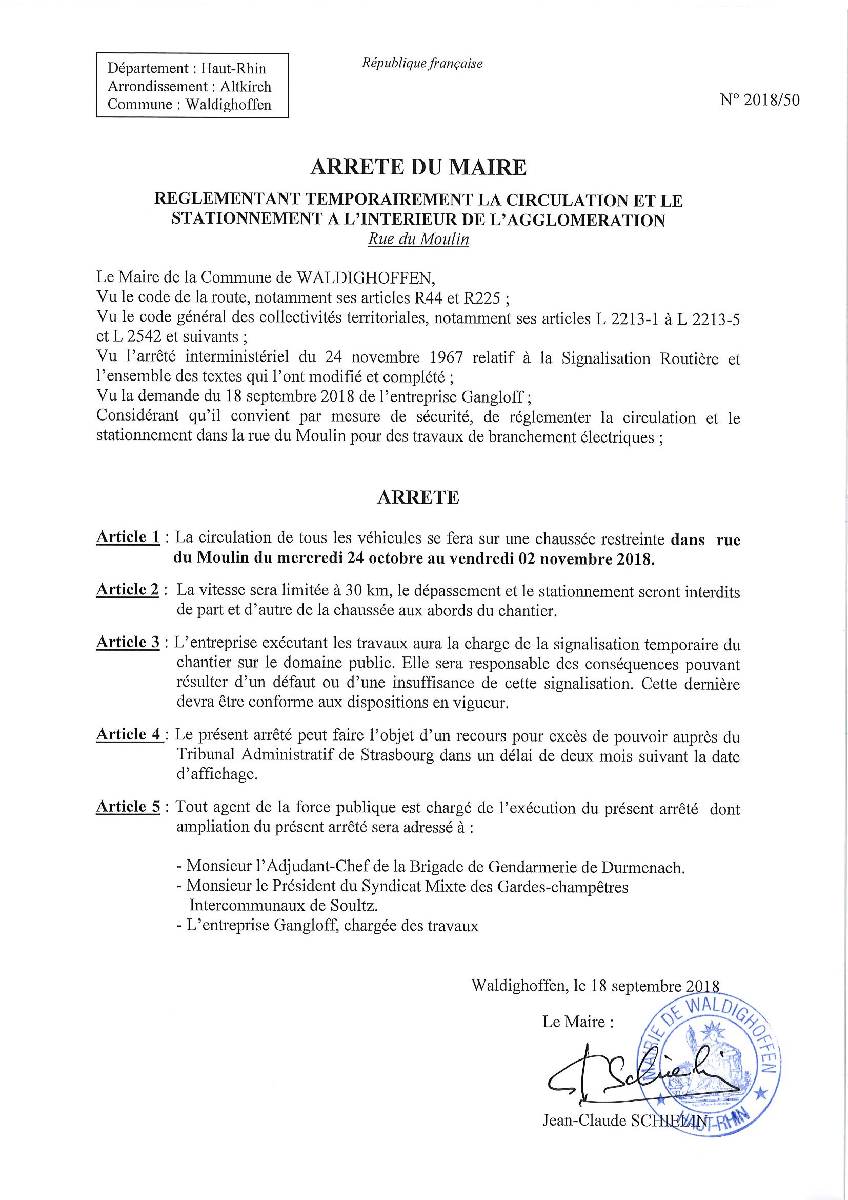 Vous êtes ici : Accueil Mairie Affichage public Annexes affichage public 2018 Arrêté - circulation rue du Moulin