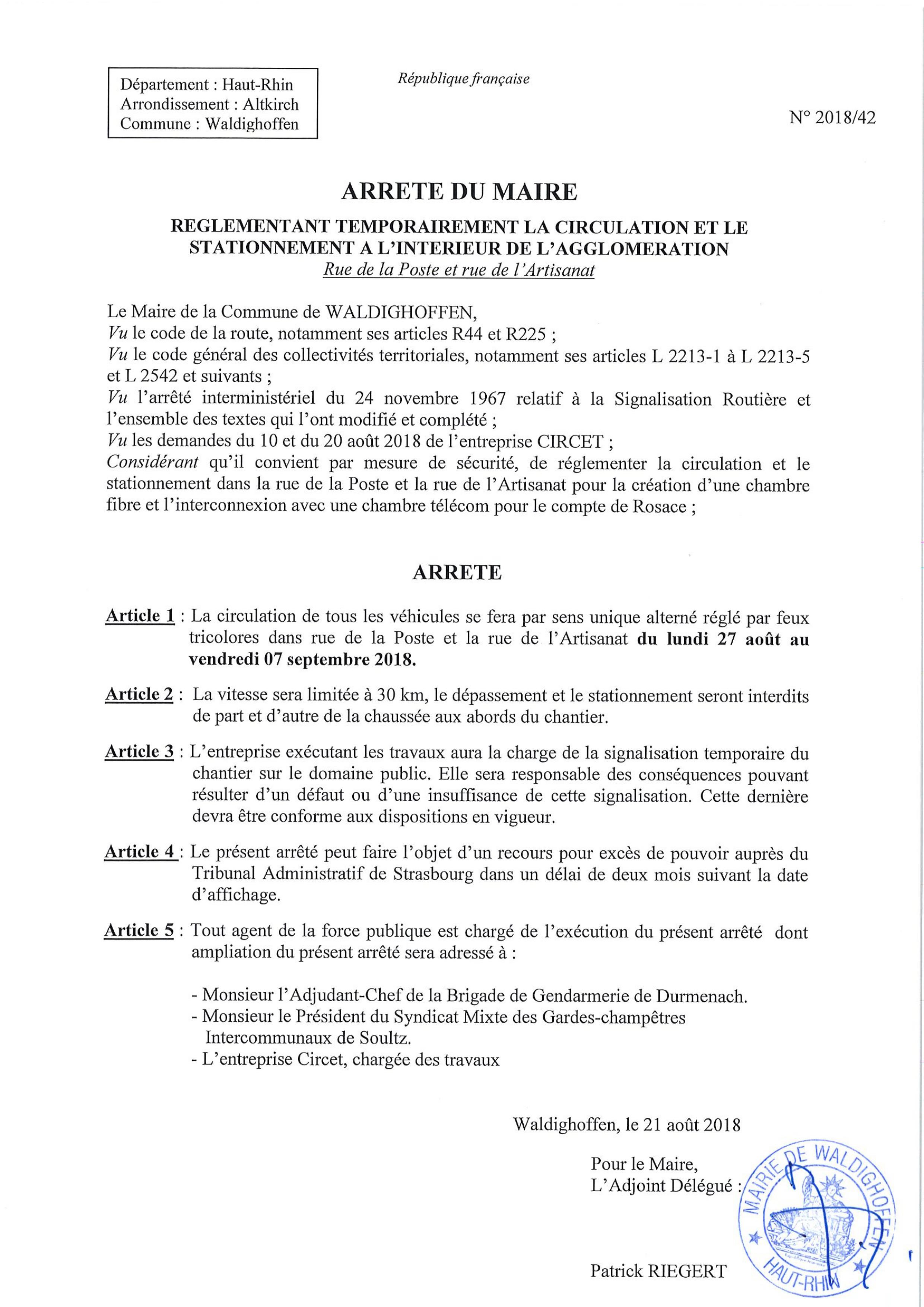 Arrêté - circulation rues de la Poste et de l'Artisanat