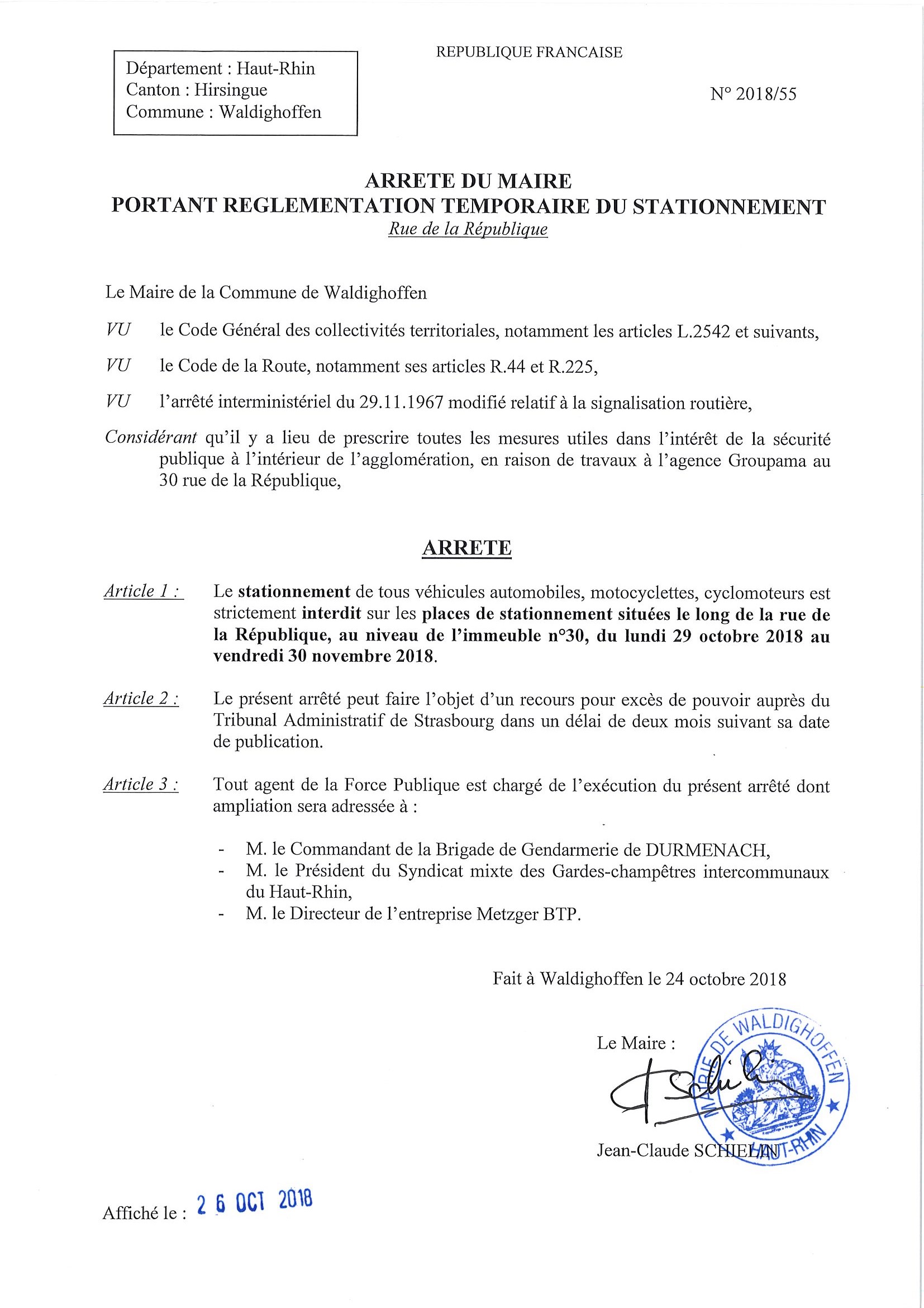 Vous êtes ici : Accueil Mairie Affichage public Annexes affichage public 2018 Arrêté du Maire : stationnement au 30 rue de la République