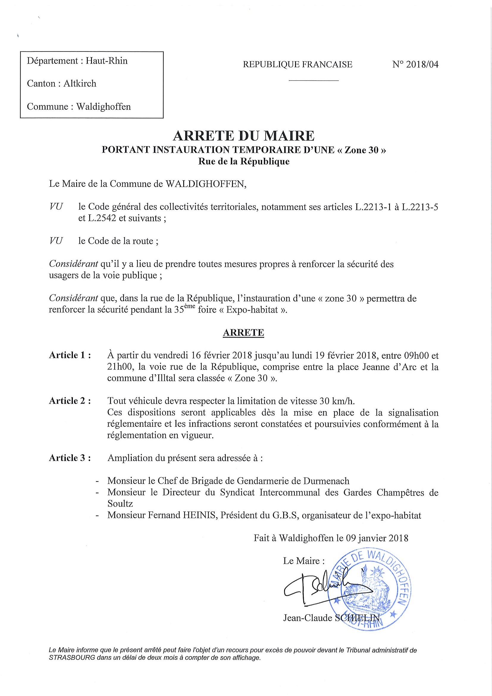 Vous êtes ici : Accueil Mairie Affichage public Annexes affichage public 2018 Arrêté instaurant une "zone 30" rue de la République