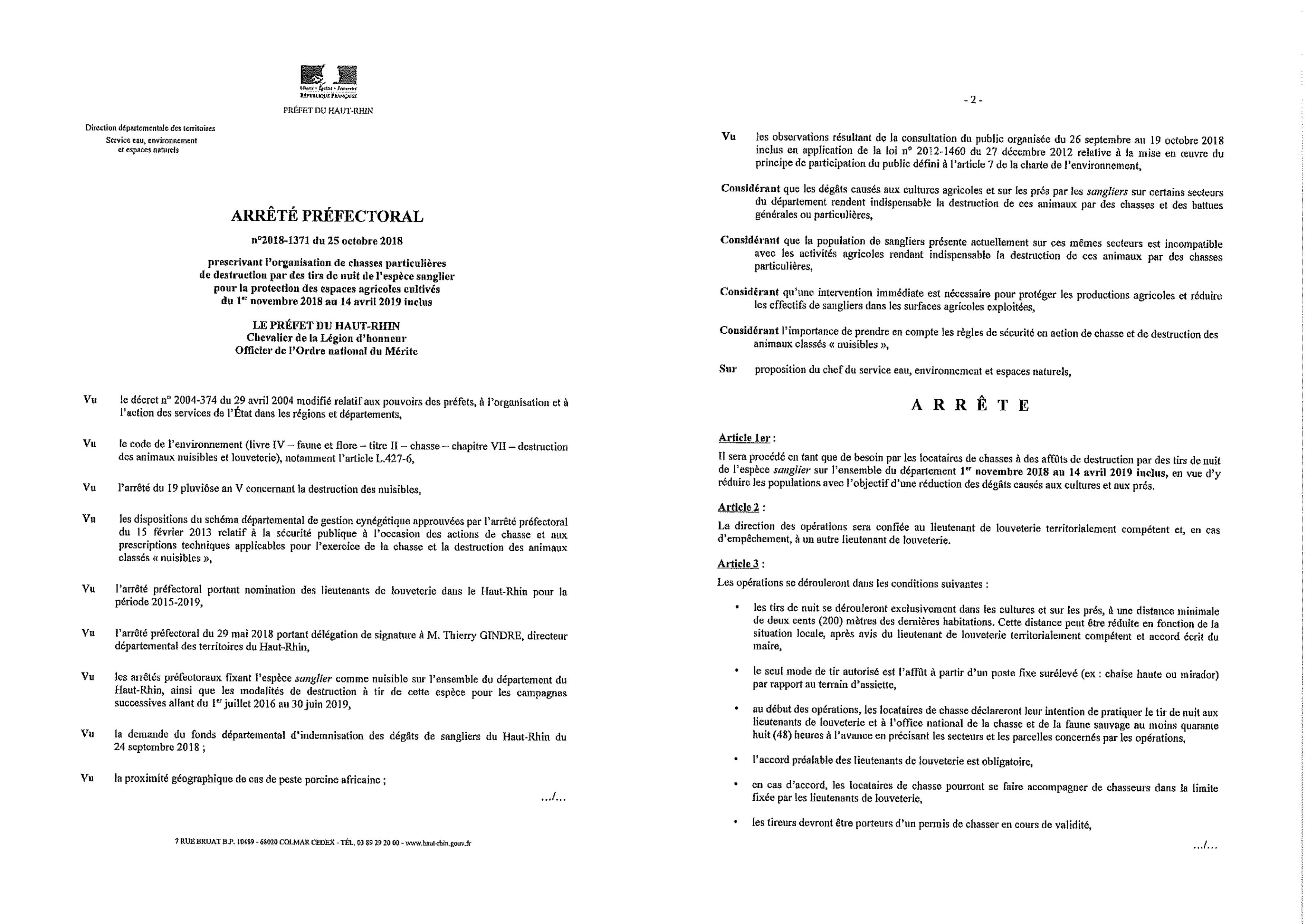 Arrêté préfectoral du 25 octobre 2018 prescrivant l'organisation de chasses particulières du 1er novembre 2018 au 14 avril 2019