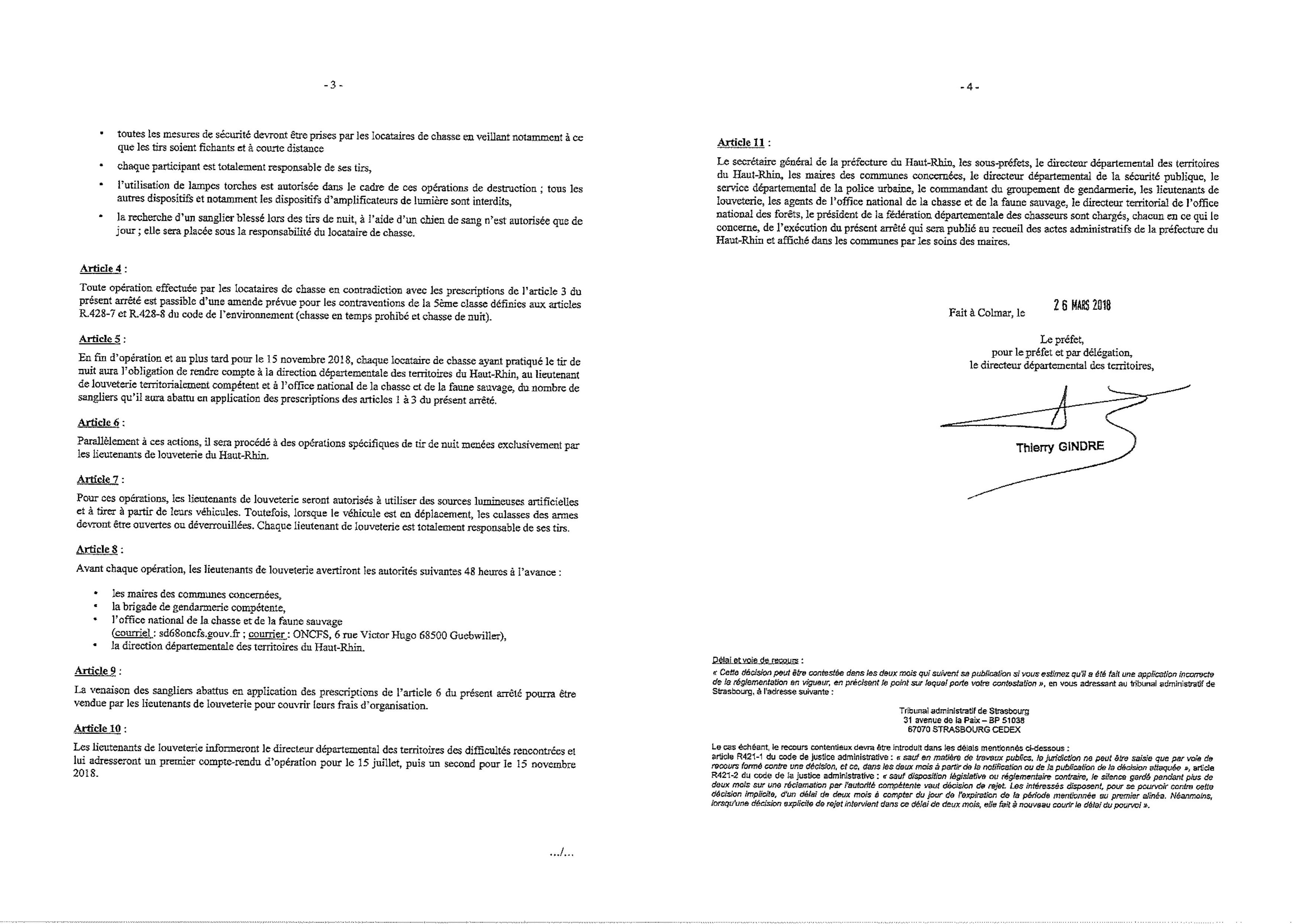 Arrêté préfectoral prescrivant l'organisation de chasses particulières de l'espèce sanglier du 1er au 20 avril 2018 inclus