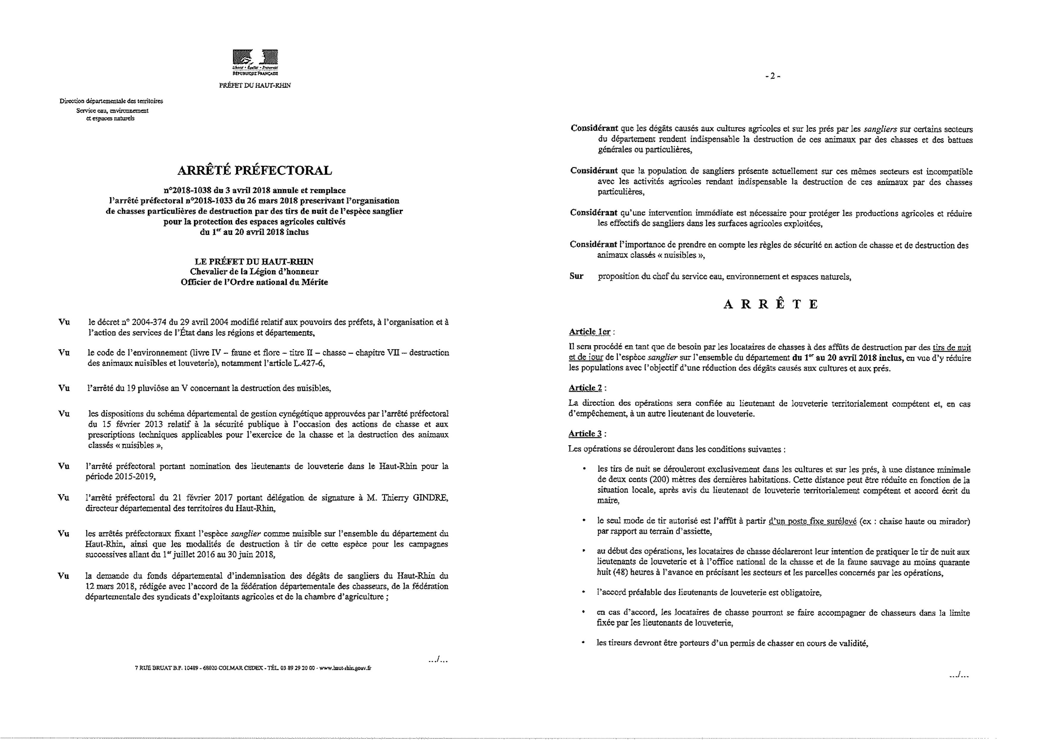 Arrêté préfectoral prescrivant l'organisation de chasses particulières de l'espèce sanglier du 1er au 20 avril 2018 inclus