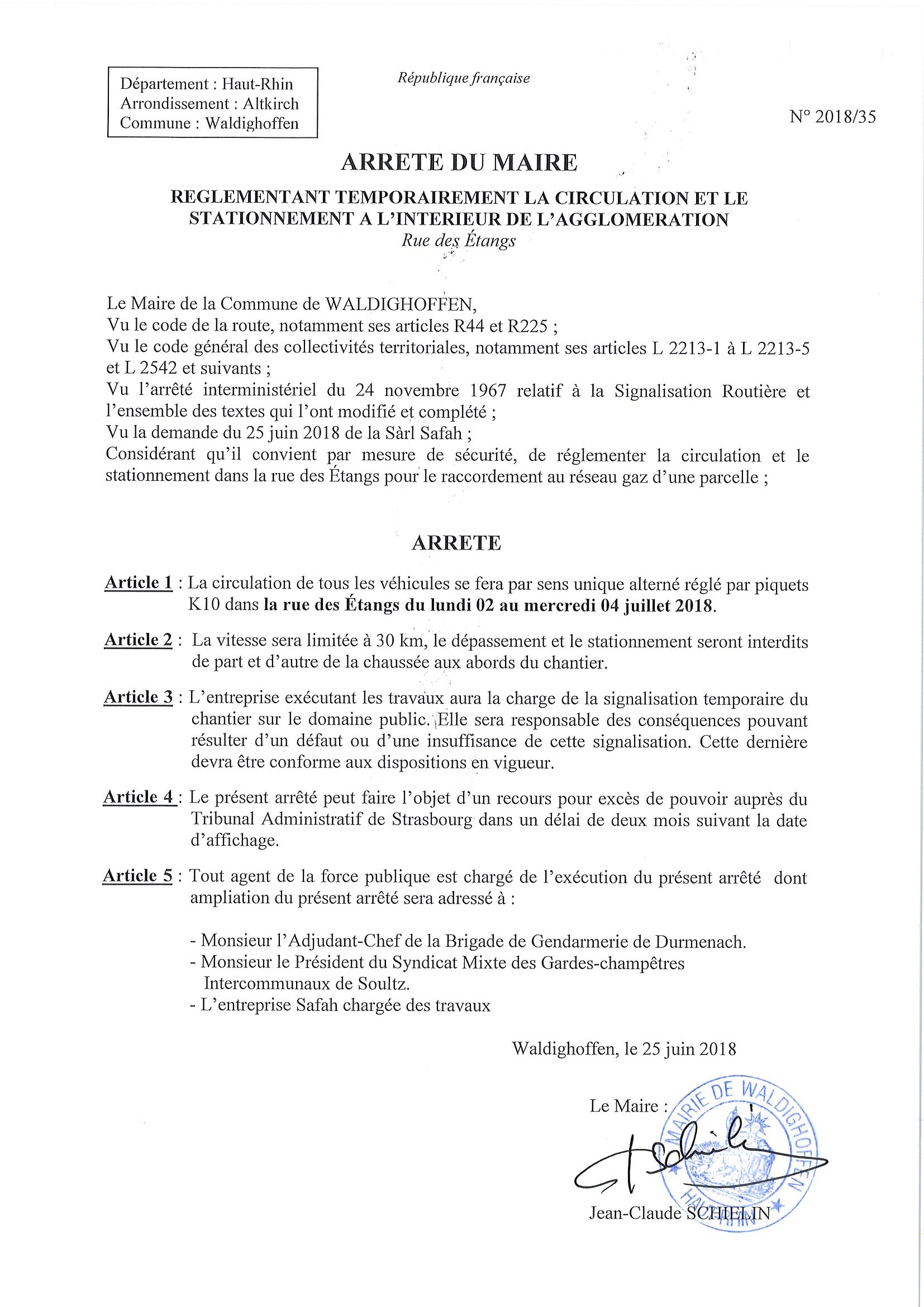 Arrêté réglementant temporairement la circulation dans la rue des Étangs du lundi 02 au mercredi 04 juillet 2018