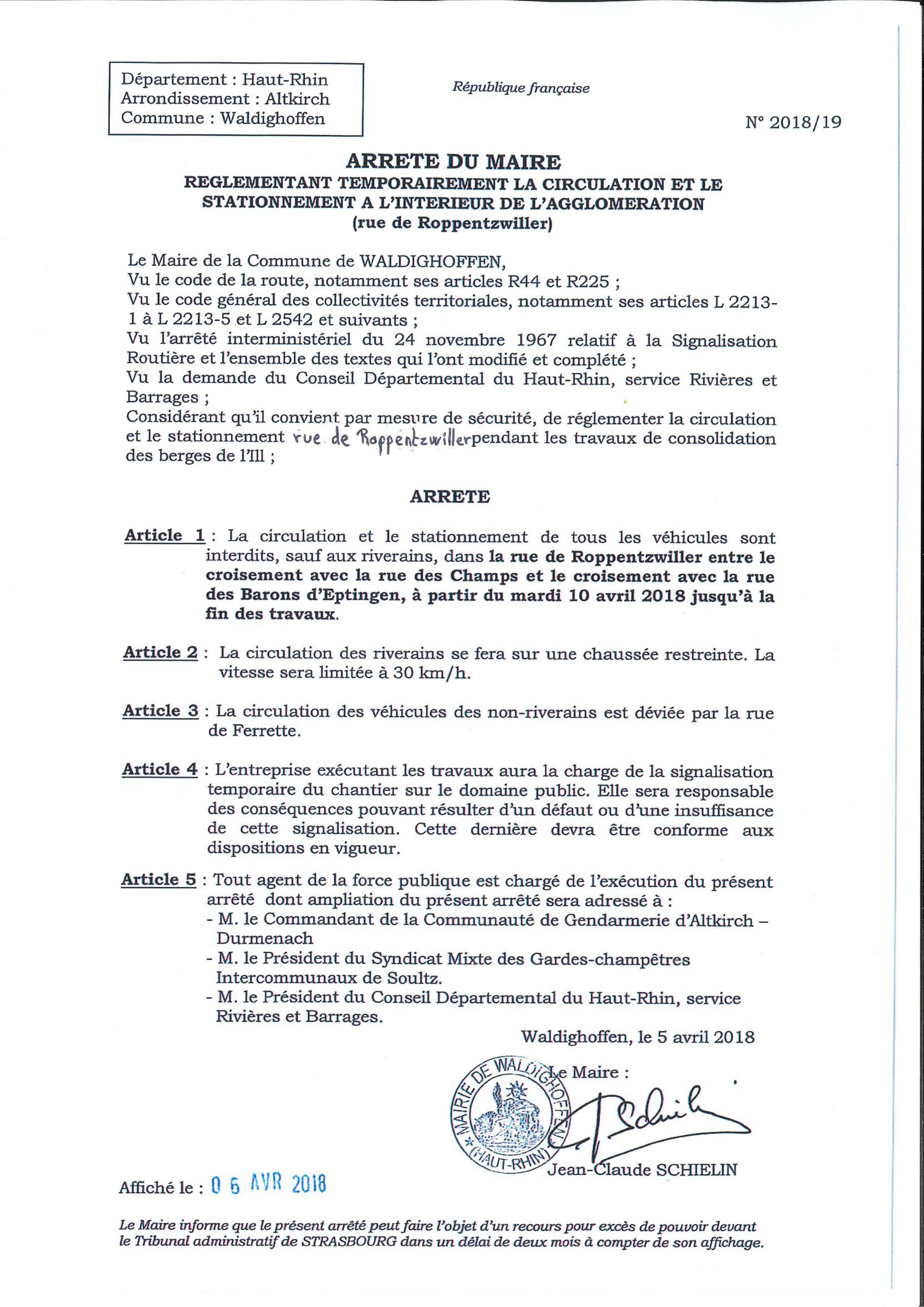Arrêté réglementant la circulation et le stationnement rue de la Roppentzwiller