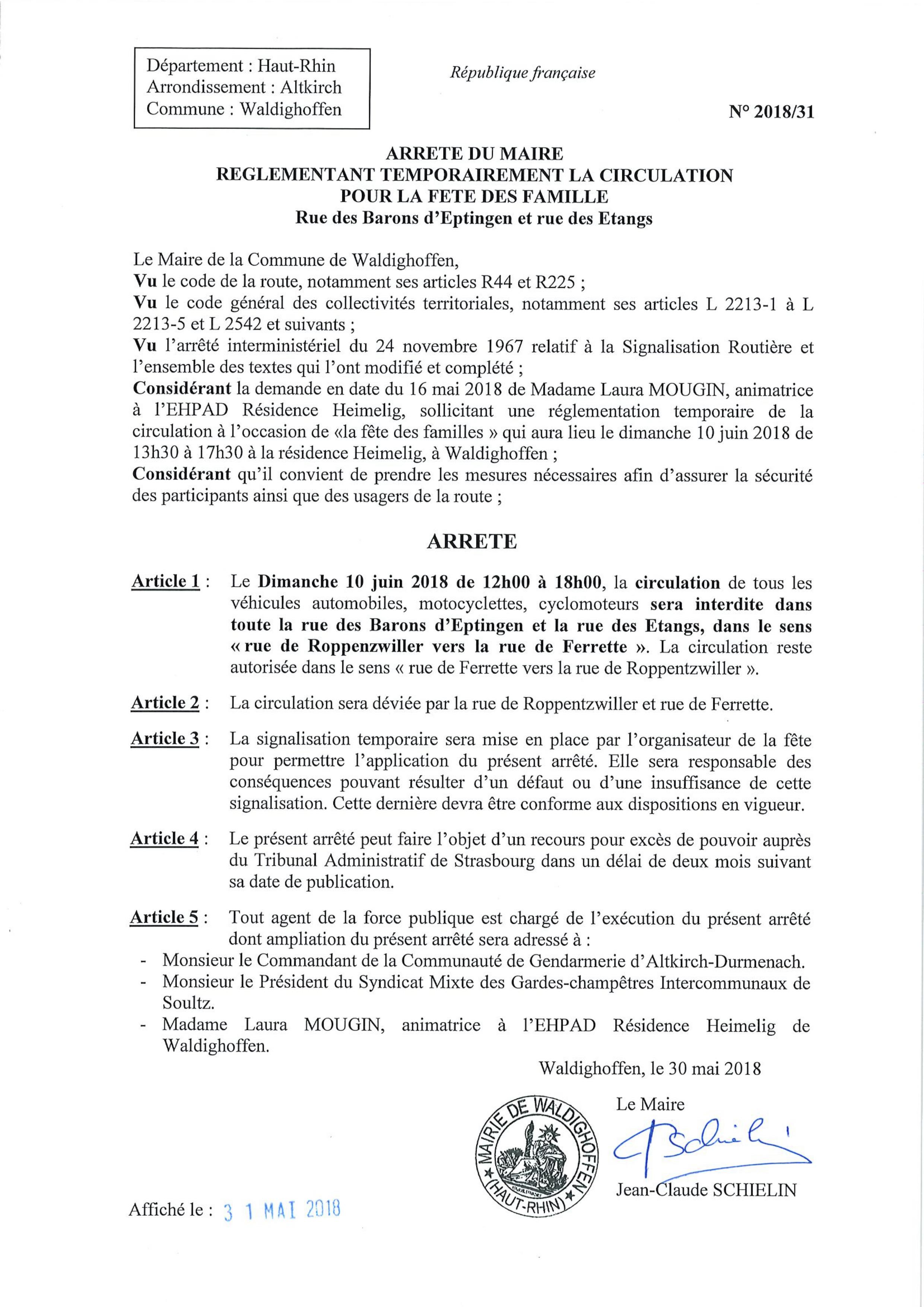 Arrêté réglementant la circulation - rue des Barons d'Eptingen et rue des Etangs