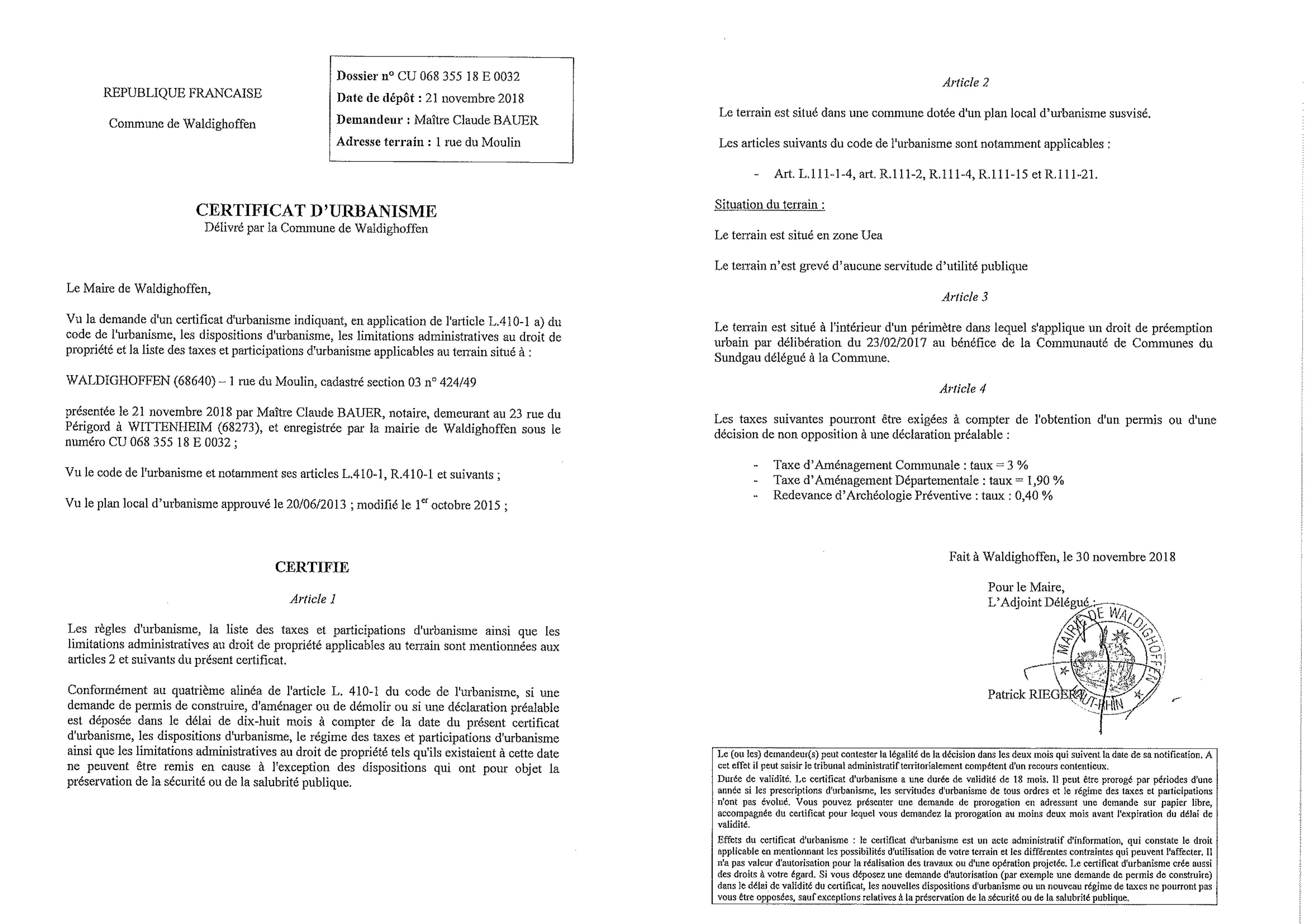 Certificat d'urbanisme établi pour Maître Claude BAUER