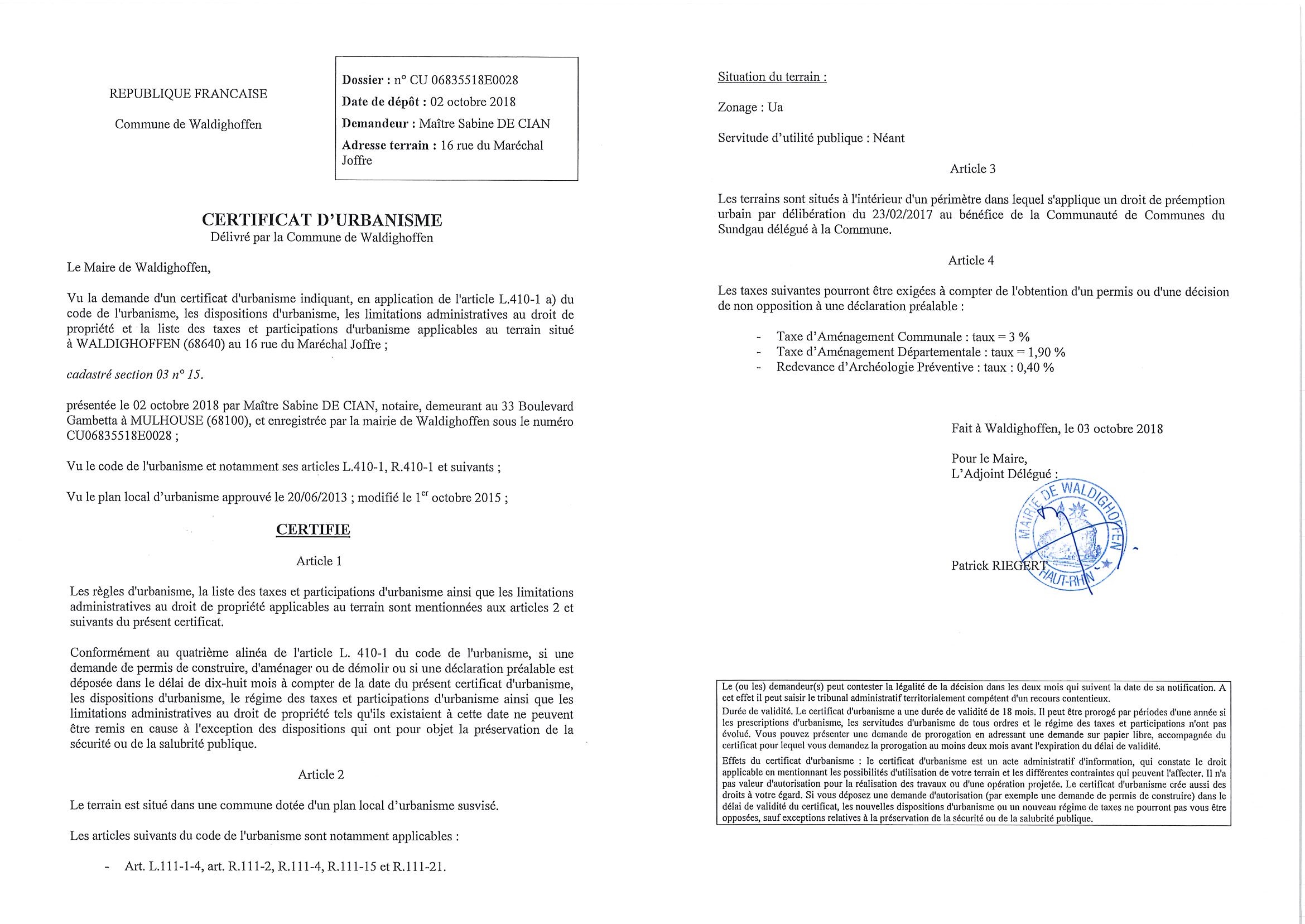 Certificat d'urbanisme établi pour Maître De Cian, notaire