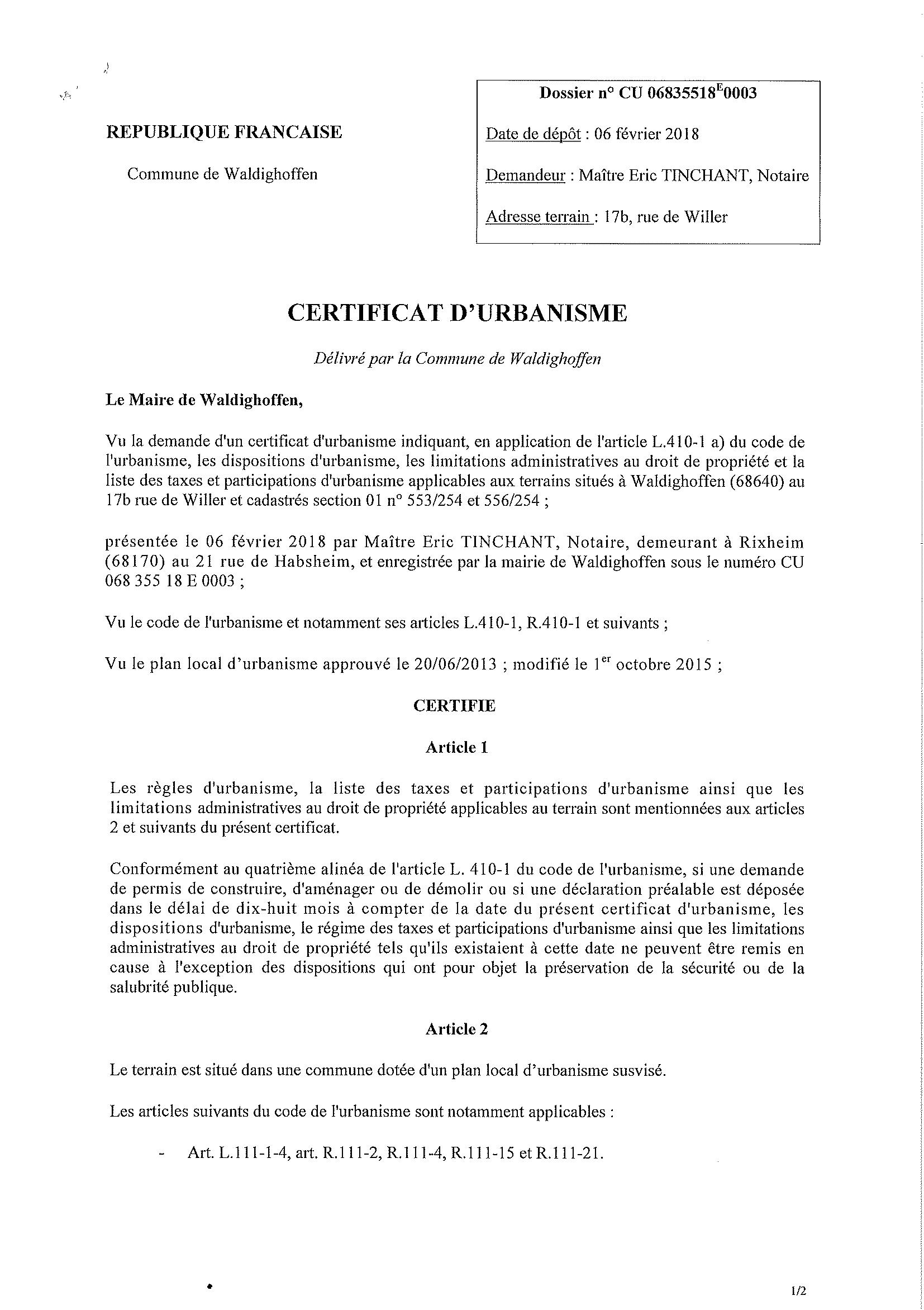 Un certificat d'urbanisme a été établi pour Maître Eric TINCHANT, concernant une parcelle située au 17b rue de Willer