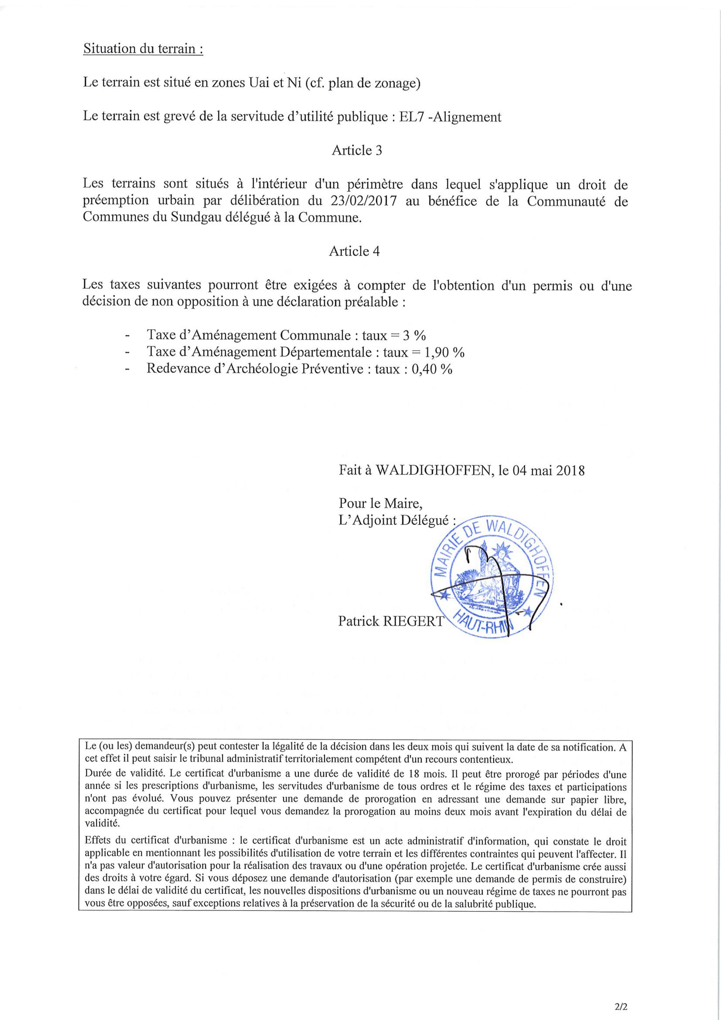 Vous êtes ici : Accueil Mairie Affichage public Annexes affichage public 2018 Certificat d'urbanisme établi pour Maître Guy GREWIS