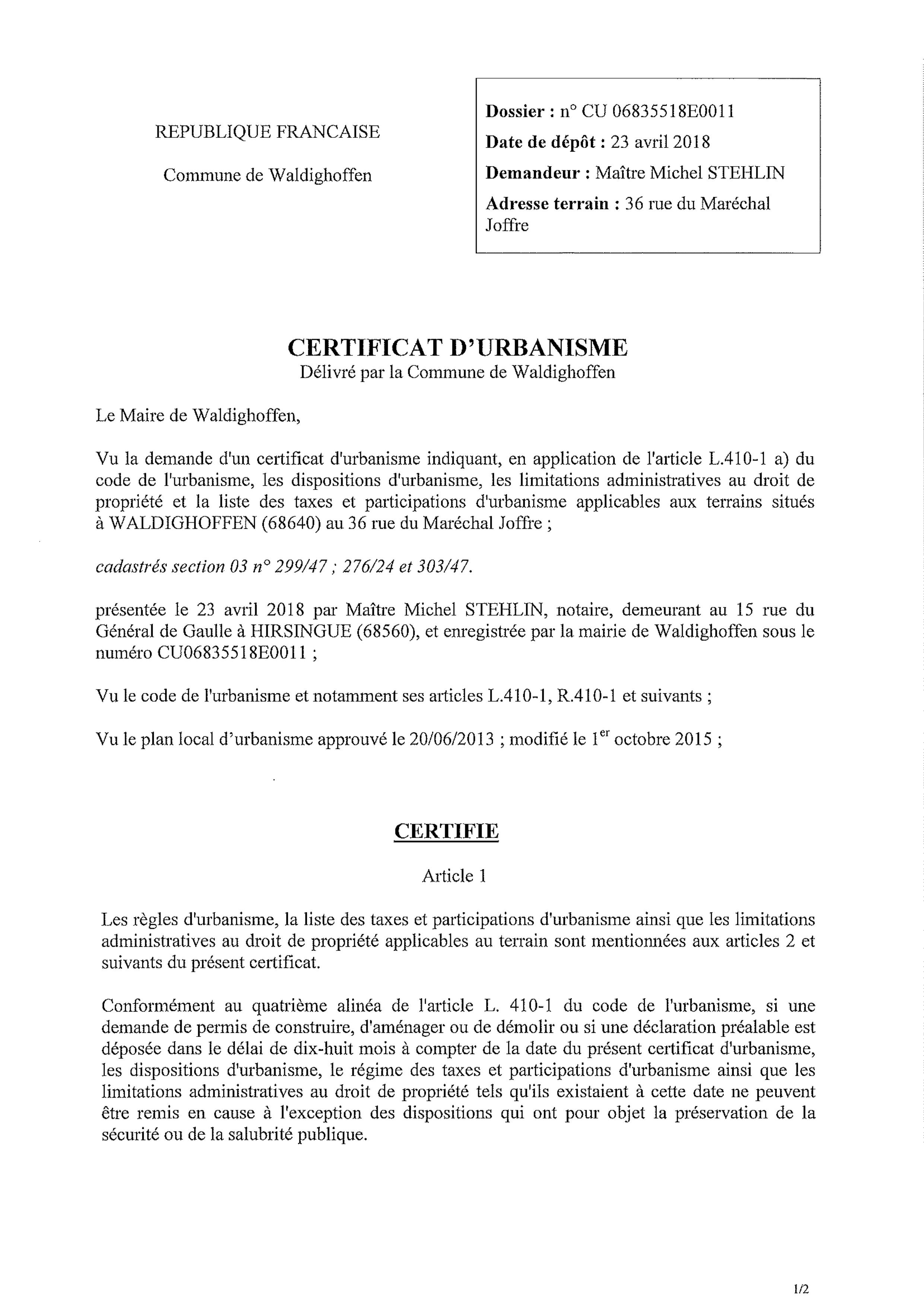 Un certificat d'urbanisme a été établi pour Maître Michel STEHLIN, concernant une parcelle située au 36 rue du Maréchal Joffre