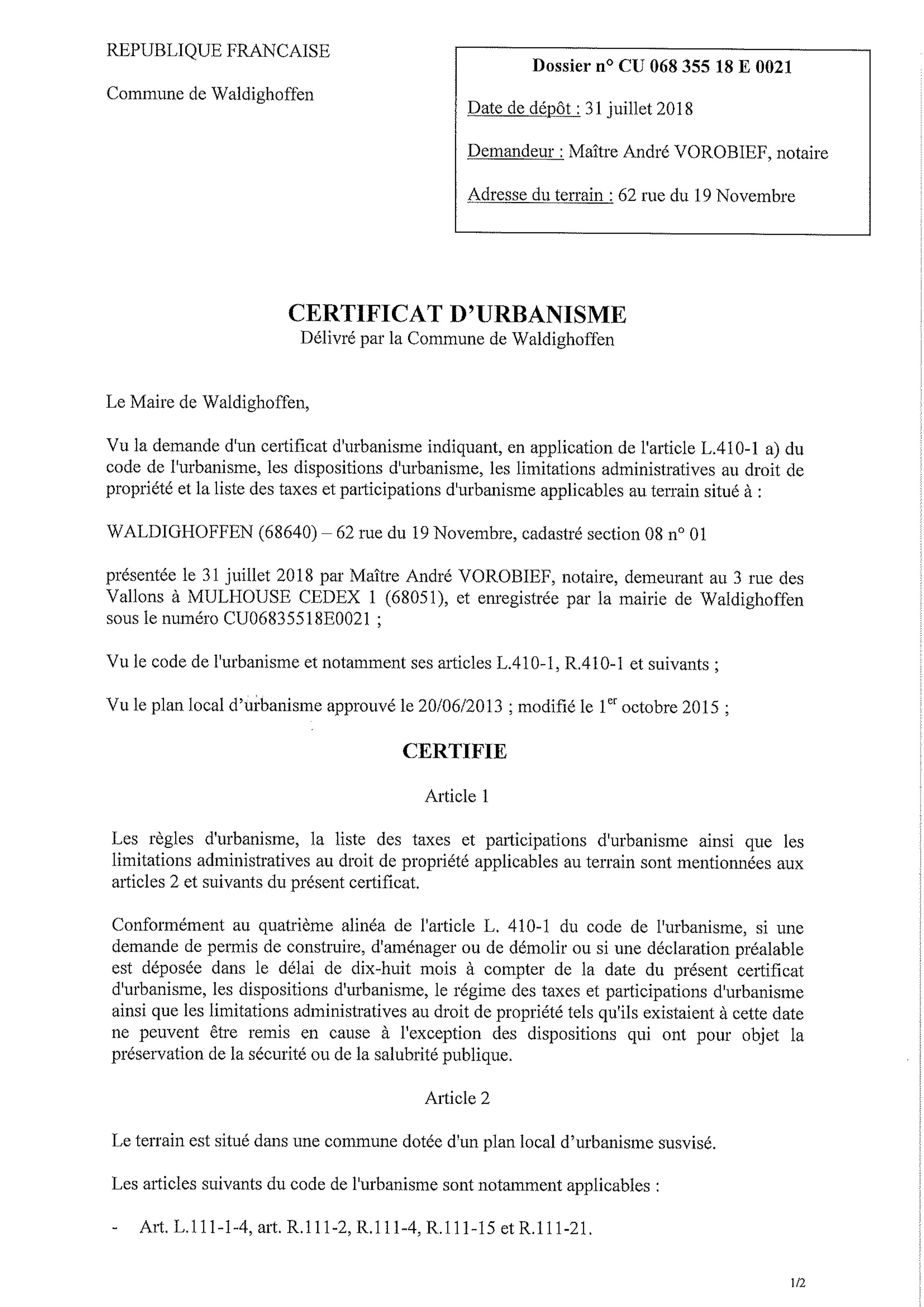 Un certificat d'urbanisme a été établi pour Maître André Vorobief, notaire, concernant une parcelle située au 62 rue du 19 Novembre