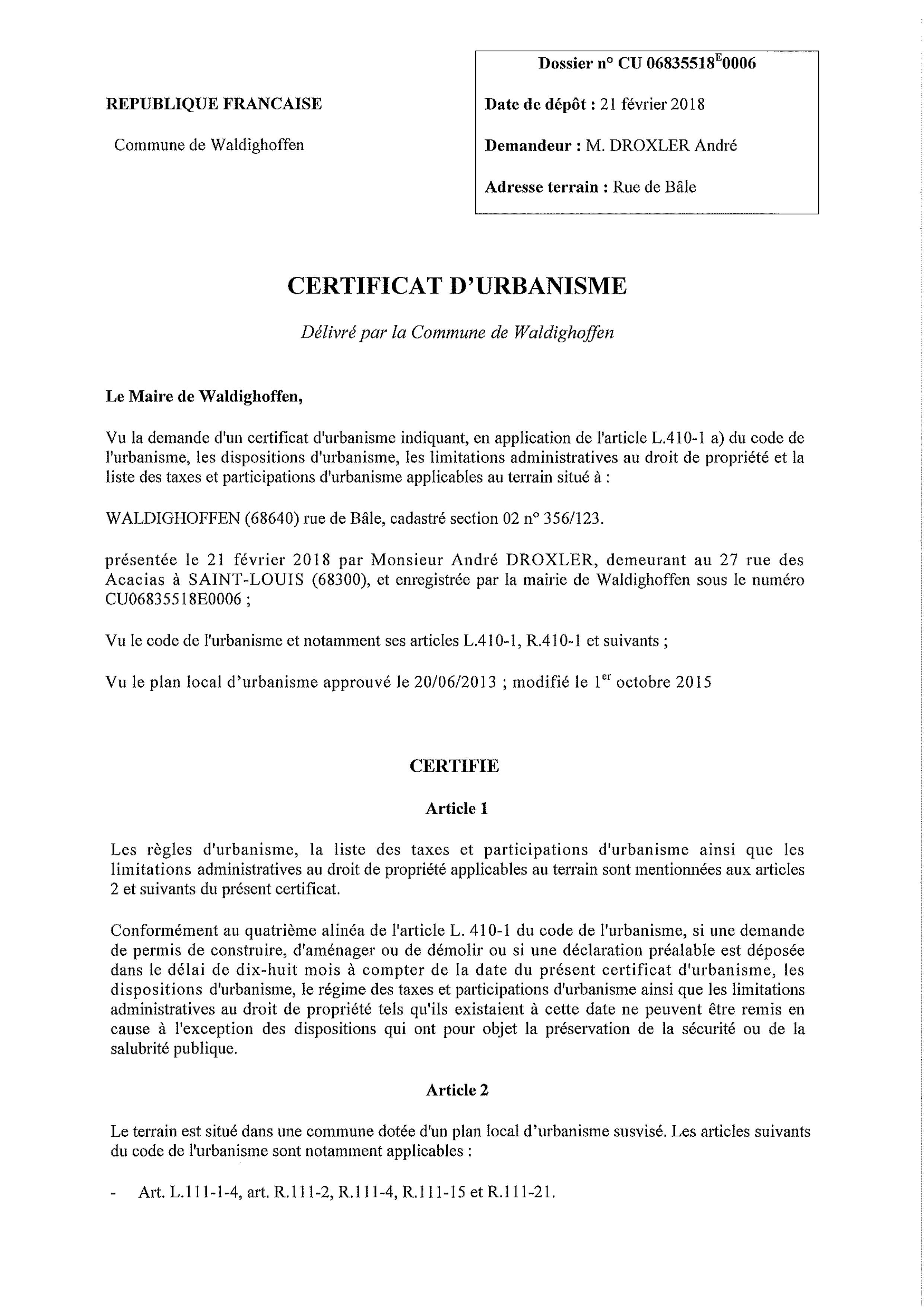 Certificat d'urbanisme établi pour Monsieur André DROXLER